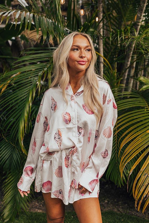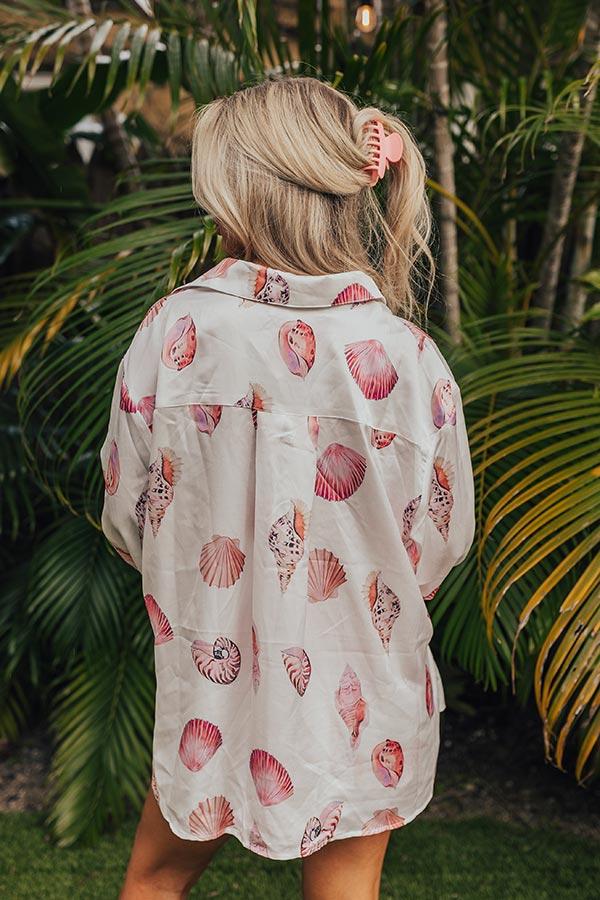 - Beach waves and sandy toes go perfectly with this adorable button up! - Unlined material with a pink and purple hued seashell print - A collared neckline - A button up front - Long, loose sleeves with button closure cuffs - A relaxed silhouette that ends in a straight hemline with side slit accents