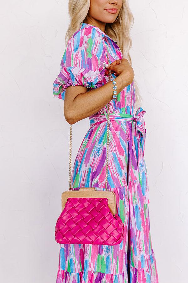 - Pull your look together with this luxe piece! A unique woven design and wooden accent clasp make it perfect for adding a touch of trendy style. - Woven faux leather material - Gold colored metal hardware - A wooden clasp for closure - A fully lined interior with a zippered pocket - A detachable chain link strap