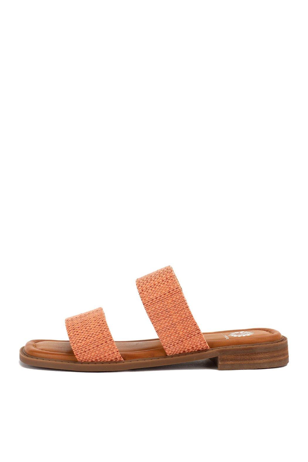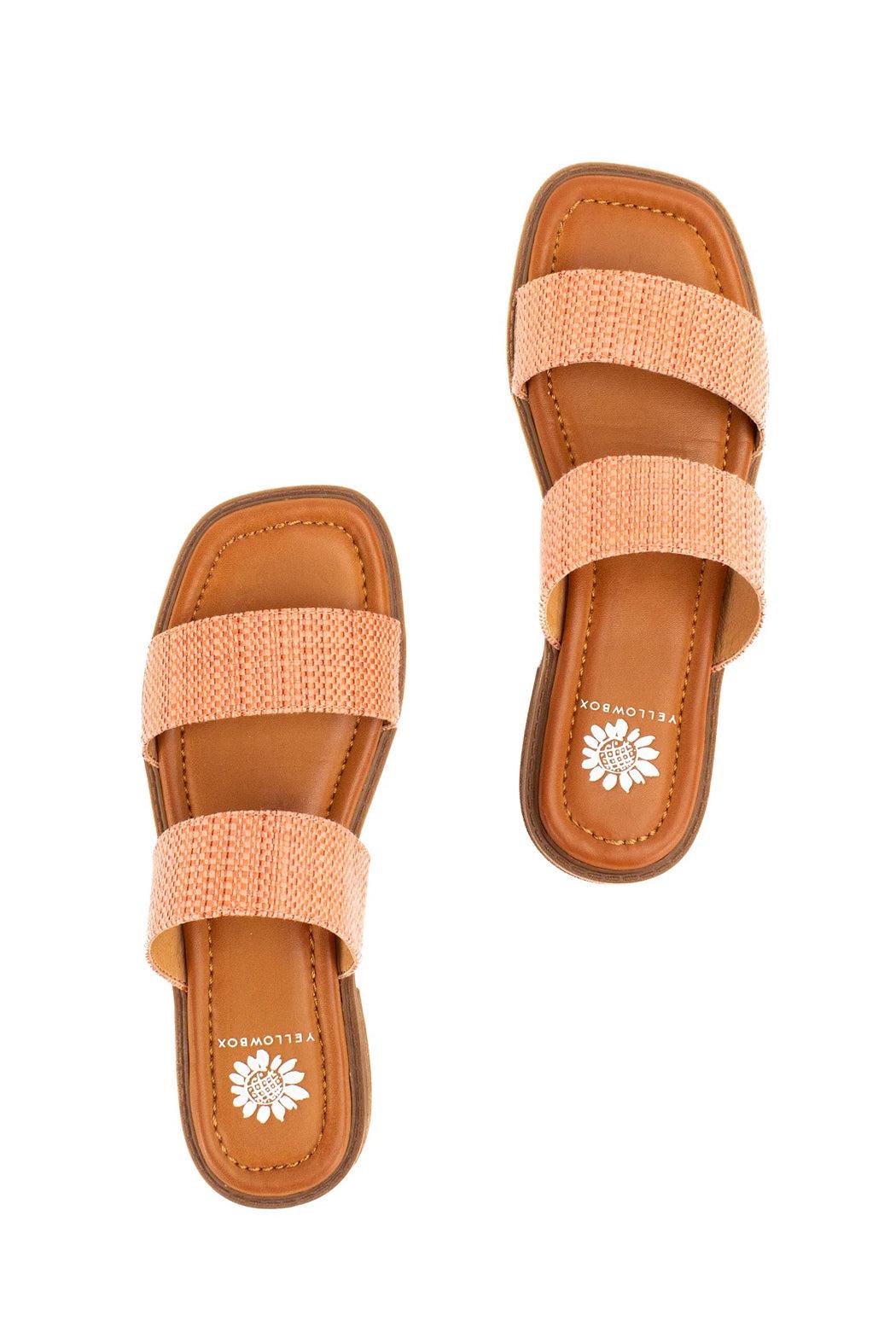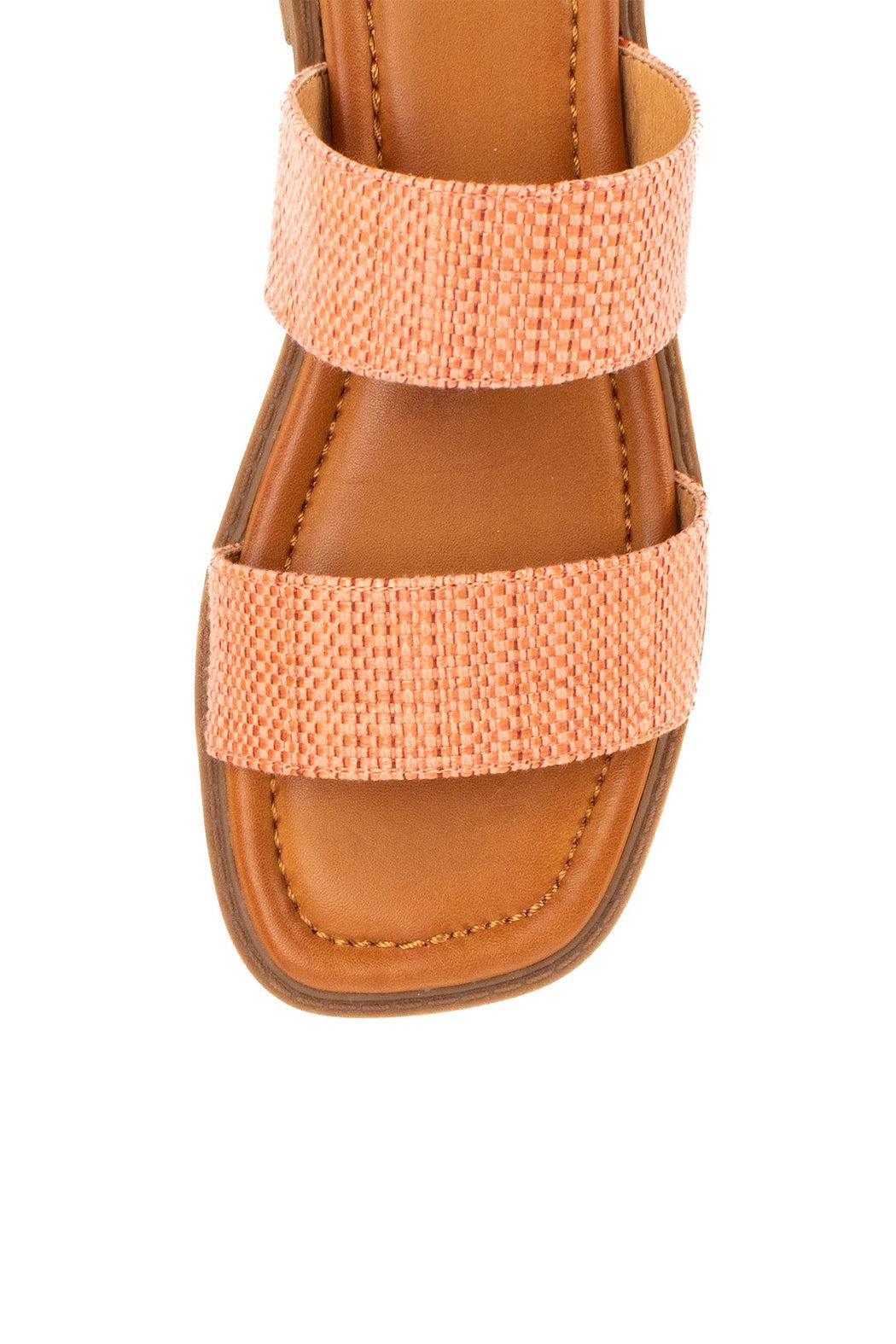 These double strap slide sandals feature salmon pink raffia straps, a square toe shape, and very low block heel. The cushioned sole and soft fabric straps make these sandals comfortable and easy to wear.