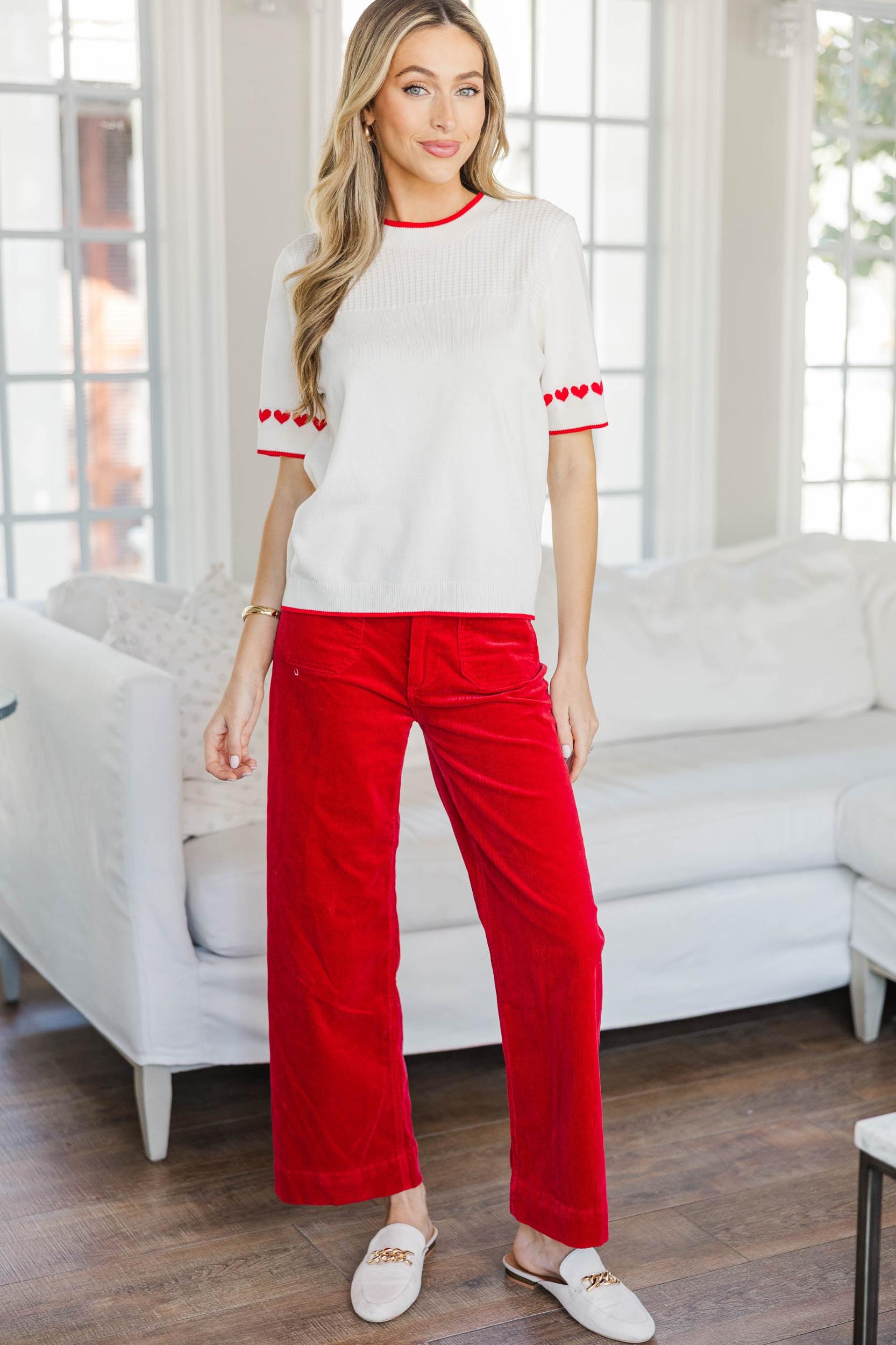This charming knit top adds a playful touch with its sweet heart-trim details and classic, easy silhouette. Soft and lightweight, it’s perfect for dressing up everyday looks while still feeling comfortable and wearable. Pair it with denim, skirts, or dressy pants for a look that’s effortlessly cute. Classic round neckline Short sleeves with heart detail Straight hemline that hits at the hip Soft knit fabric Moderate stretch London is wearing the small.