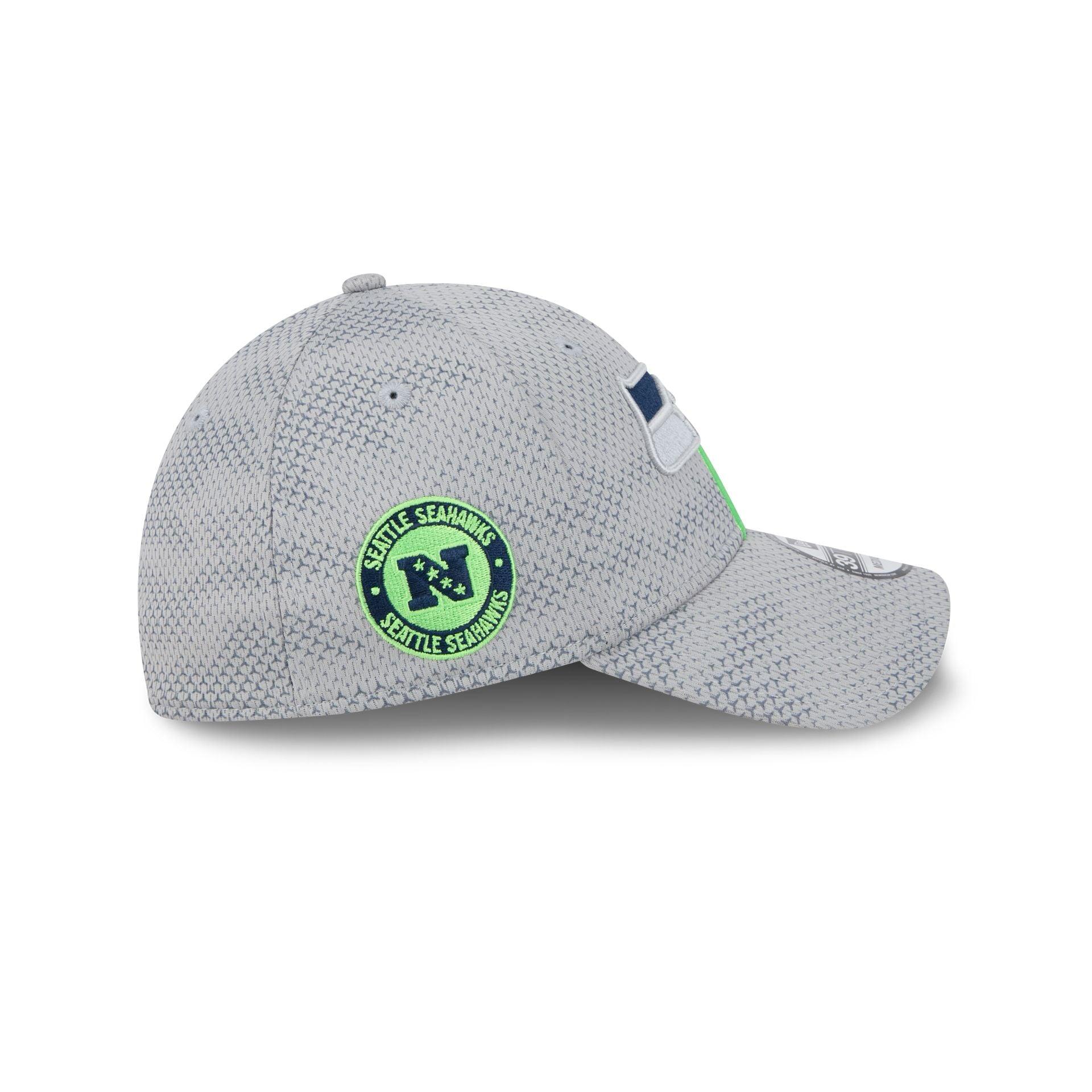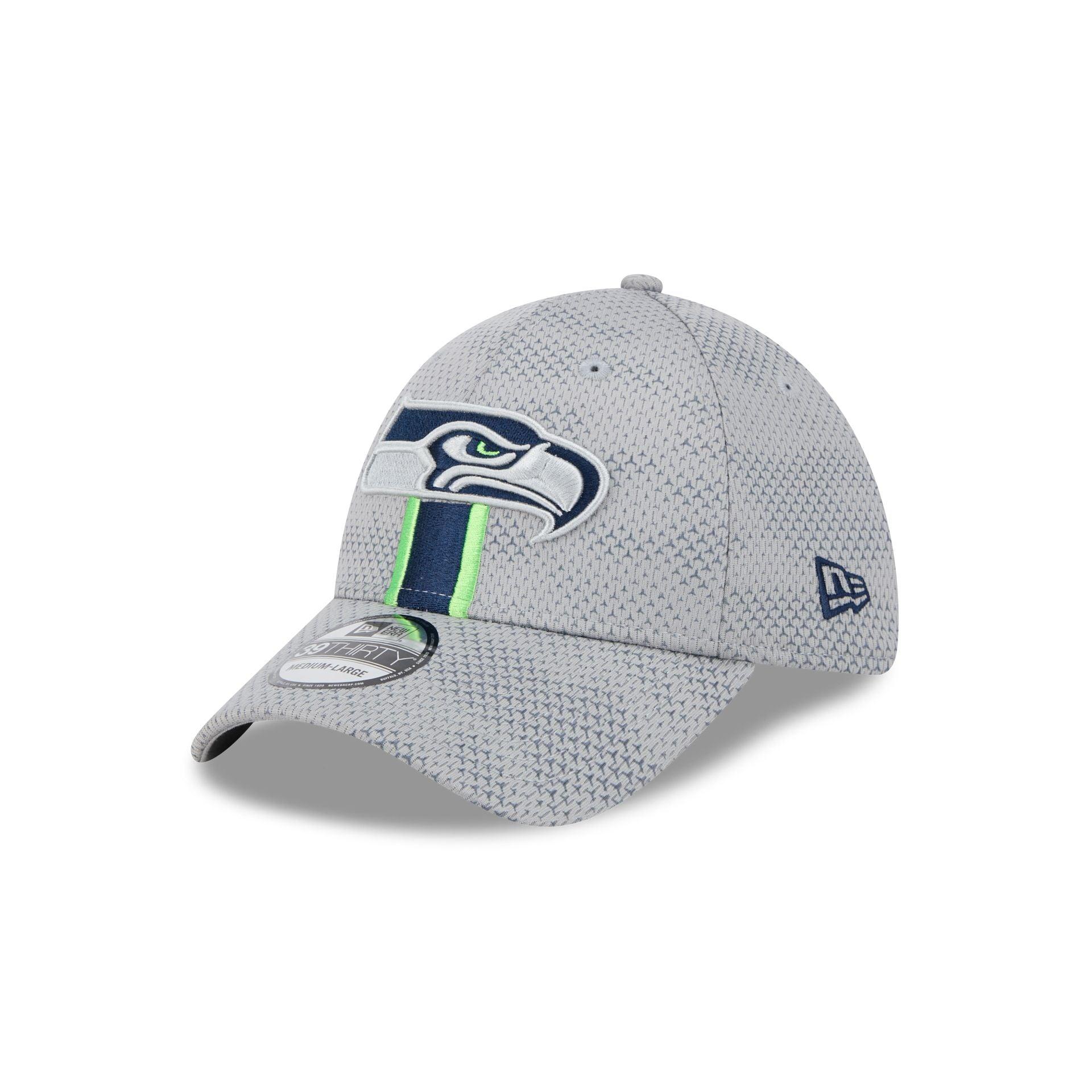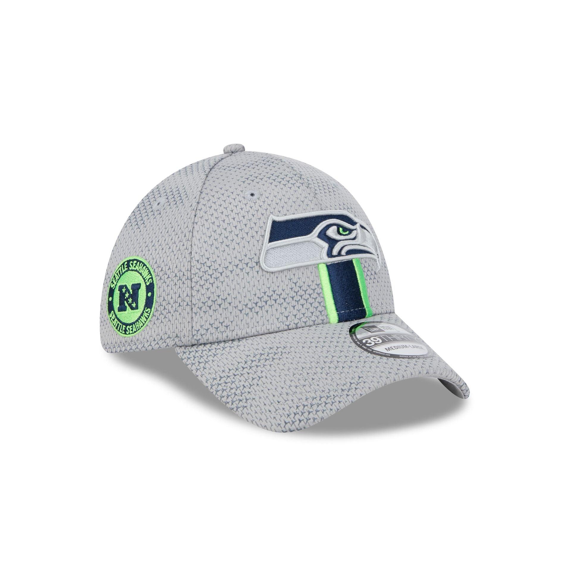 The Seattle Seahawks 2024 Sideline 39THIRTY Stretch Fit Hat features an embroidered Seahawks logo at the front panels with a matching NFL Shield at the rear. Additional details include a Conference patch at the right-wear side and a gray undervisor.