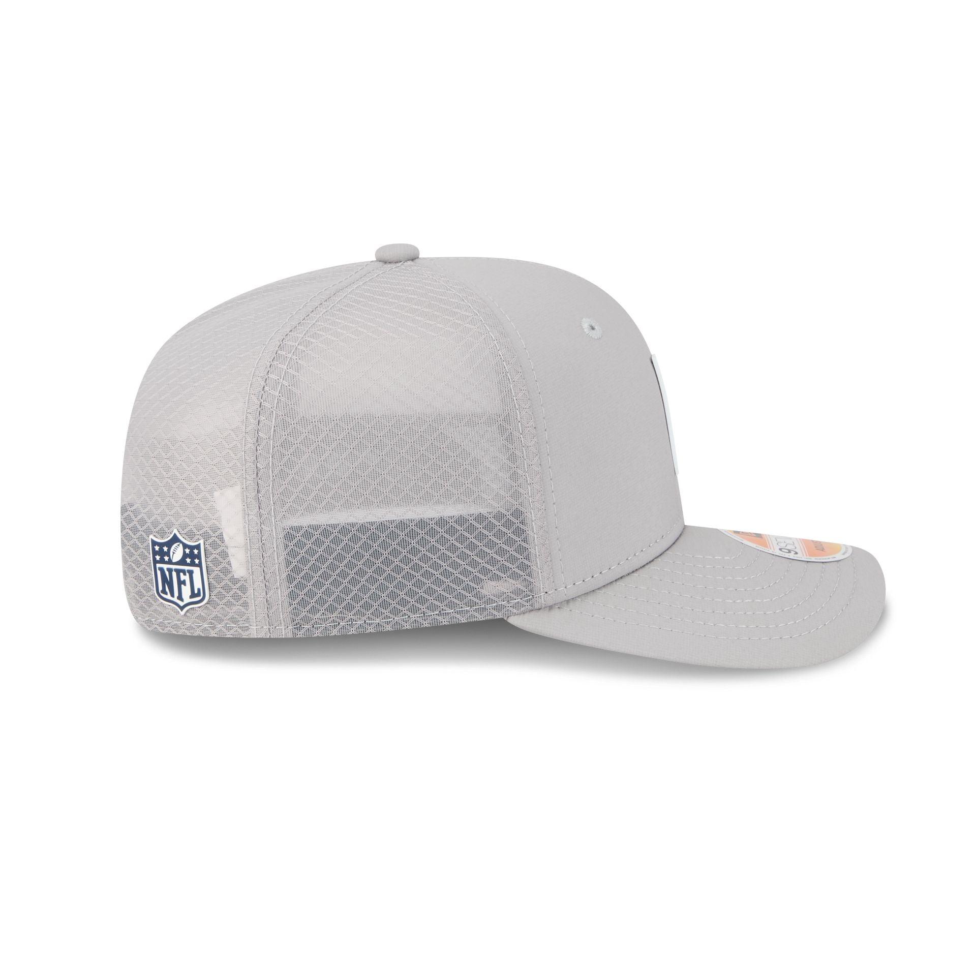 The Seattle Seahawks 2025 Sideline Hot Weather Gray 9SEVENTY Trucker features a sewn-down silicone Seahawks logo patch at the front panels with a water-repellent quill tech fabrication throughout and a quick-dry cushioned sweatband to absorb moisture. Additional details include the Official NFL Shield logo to the right of a soft silicone snapback closure at a light-weight mesh rear. The undervisor is accented with a silicone transfer in the team’s colors.