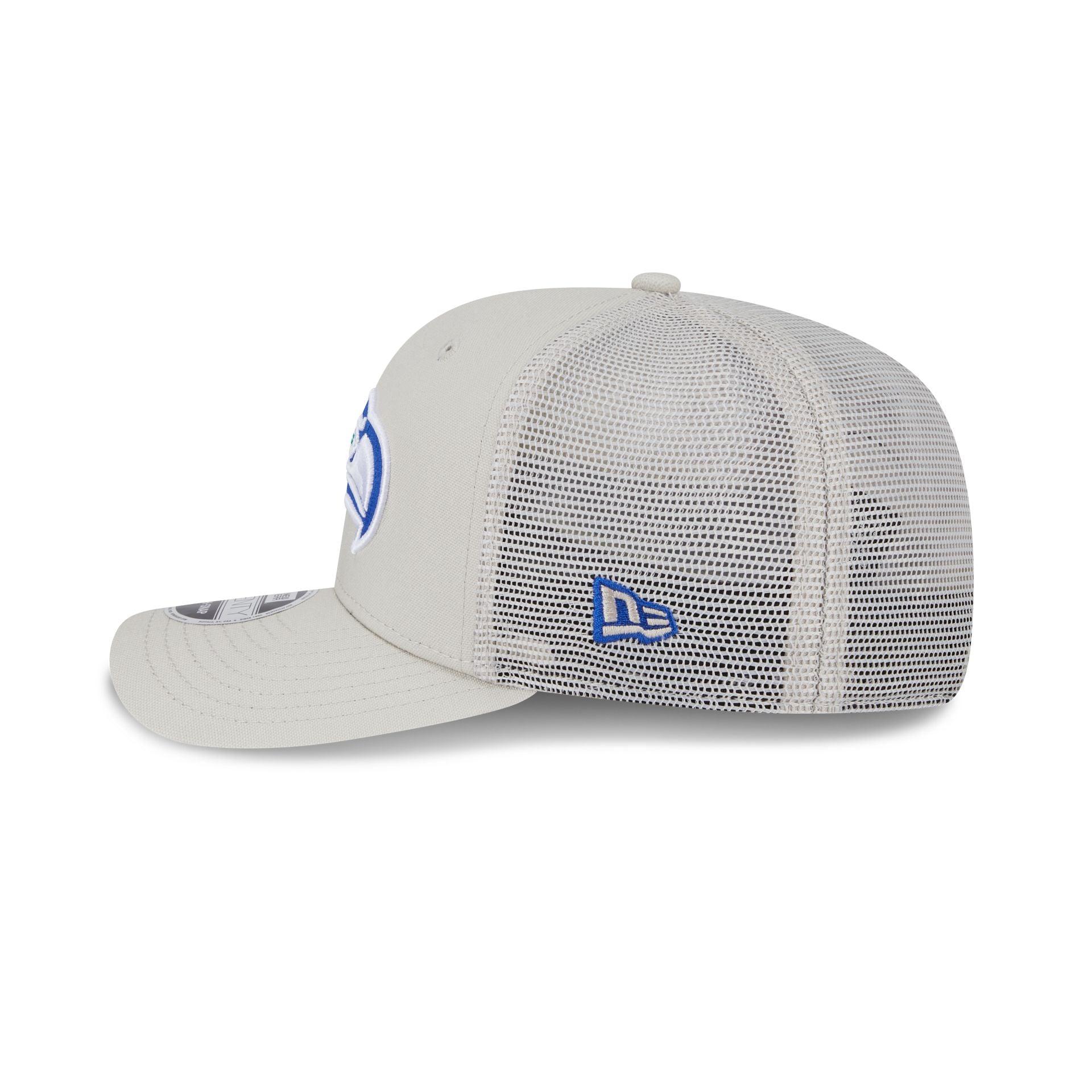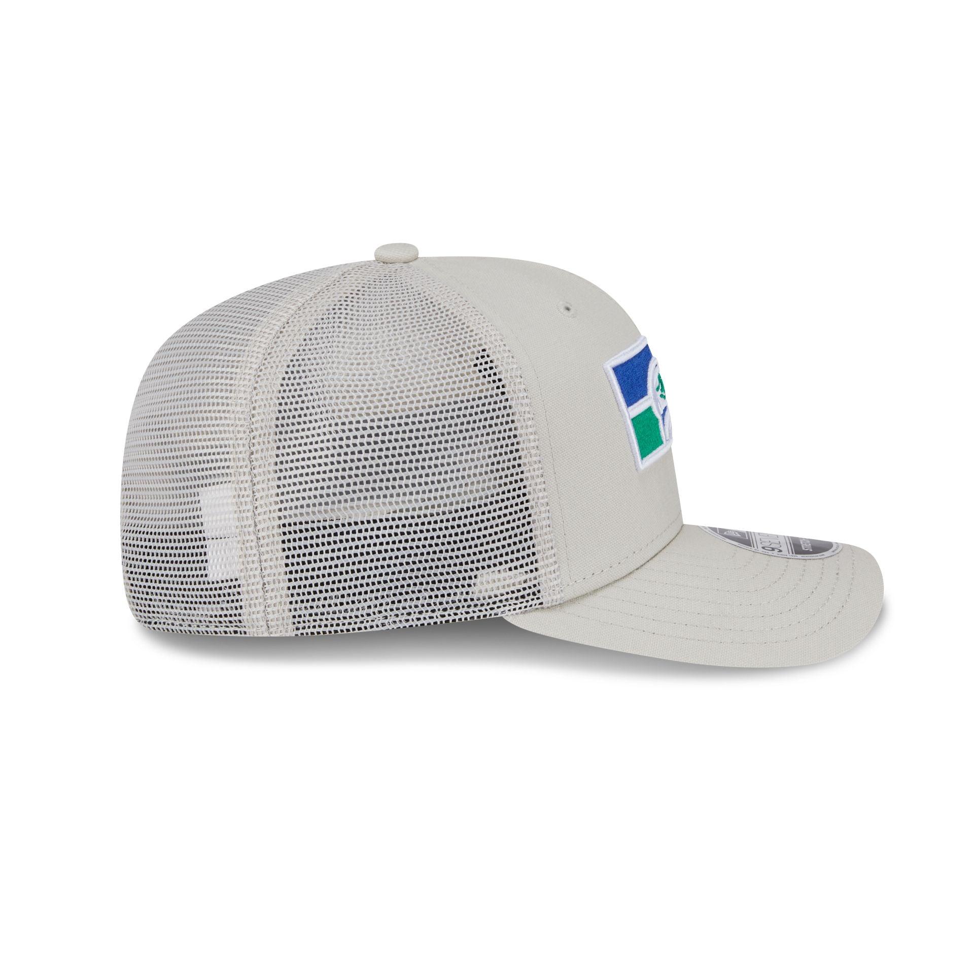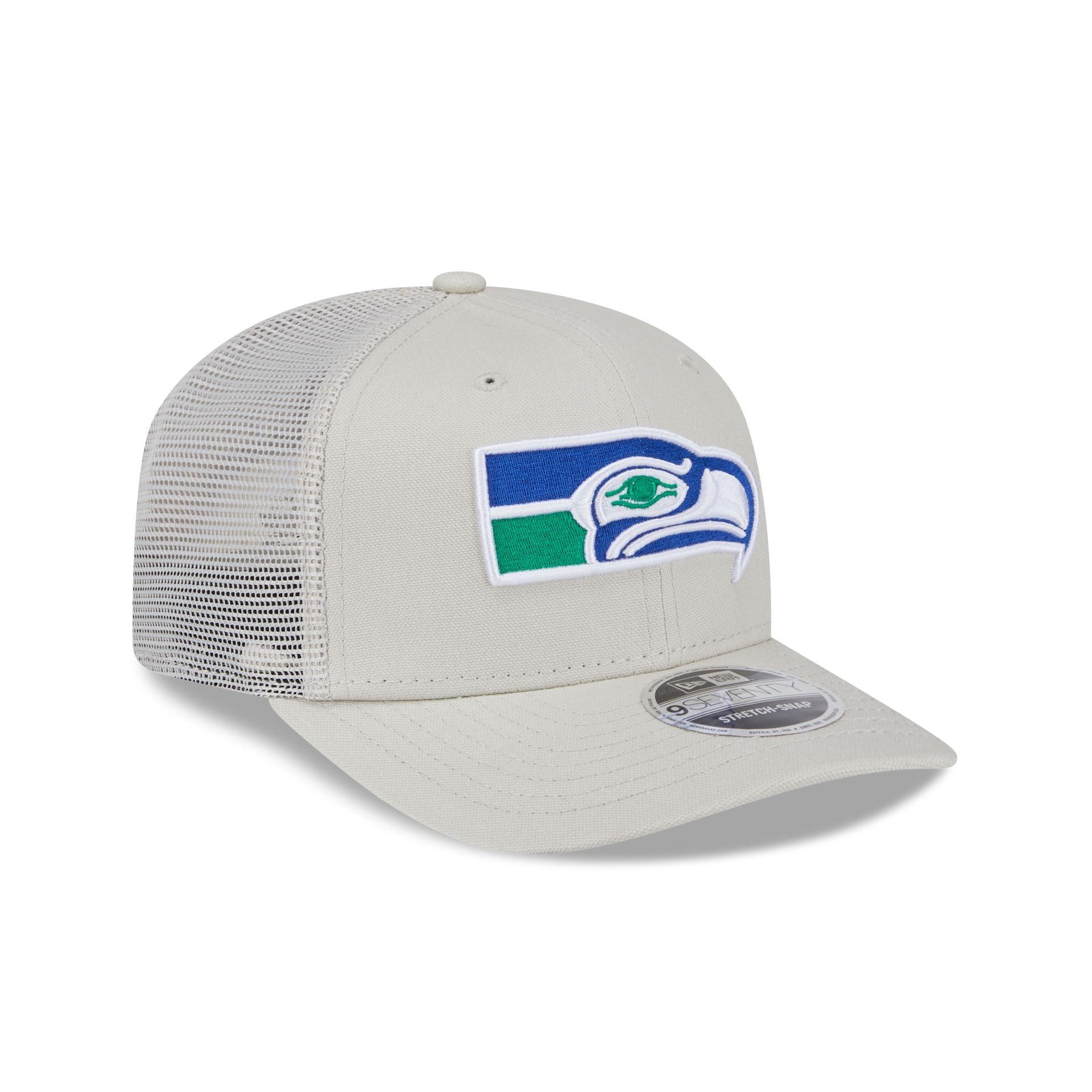 The Seattle Seahawks Canvas 9SEVENTY Trucker features an embroidered Seahawks Historic logo at the front panels with a matching New Era Flag at the left-wear side. Additional details include a gray undervisor and a snapback closure a the rear.