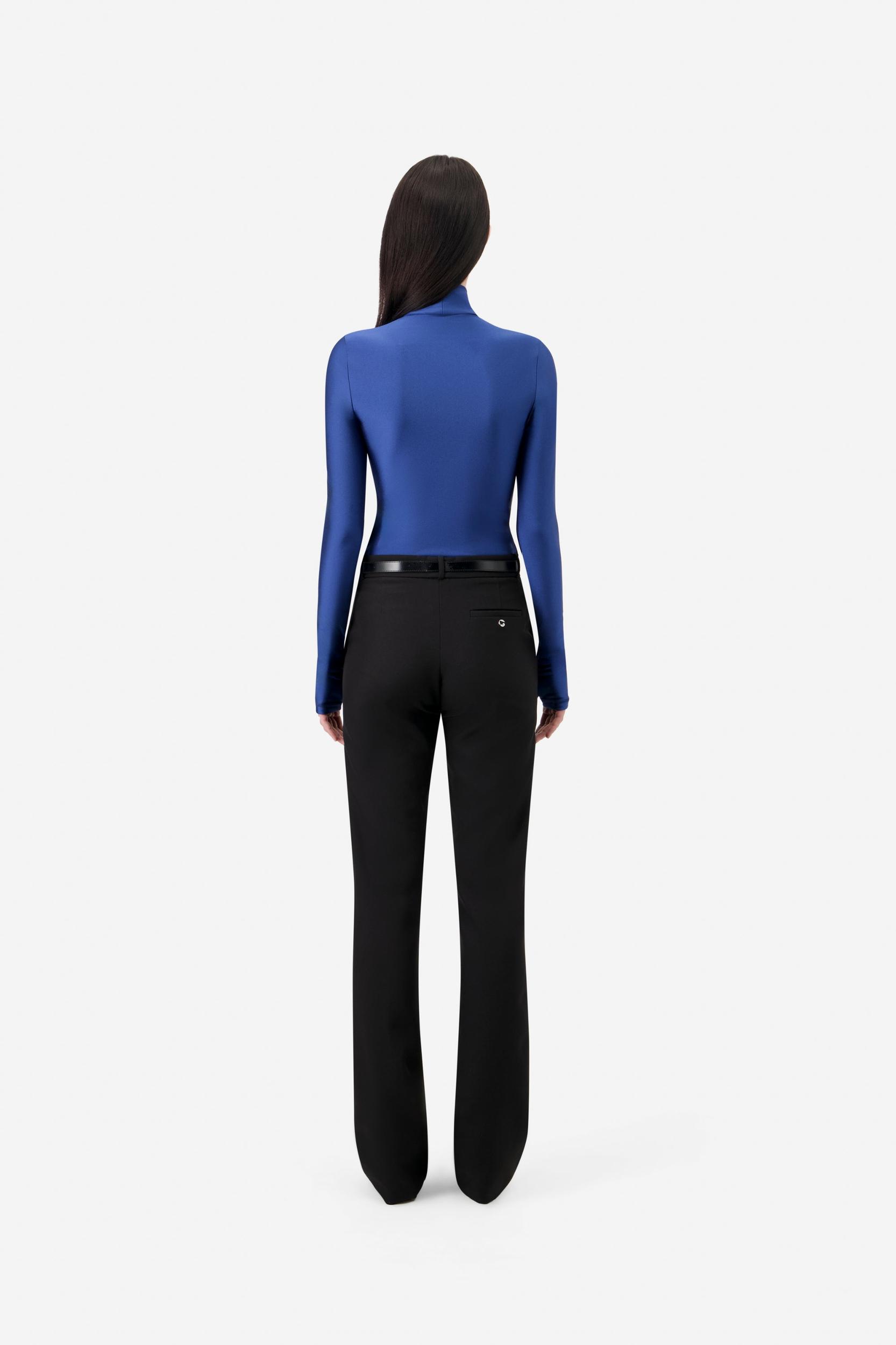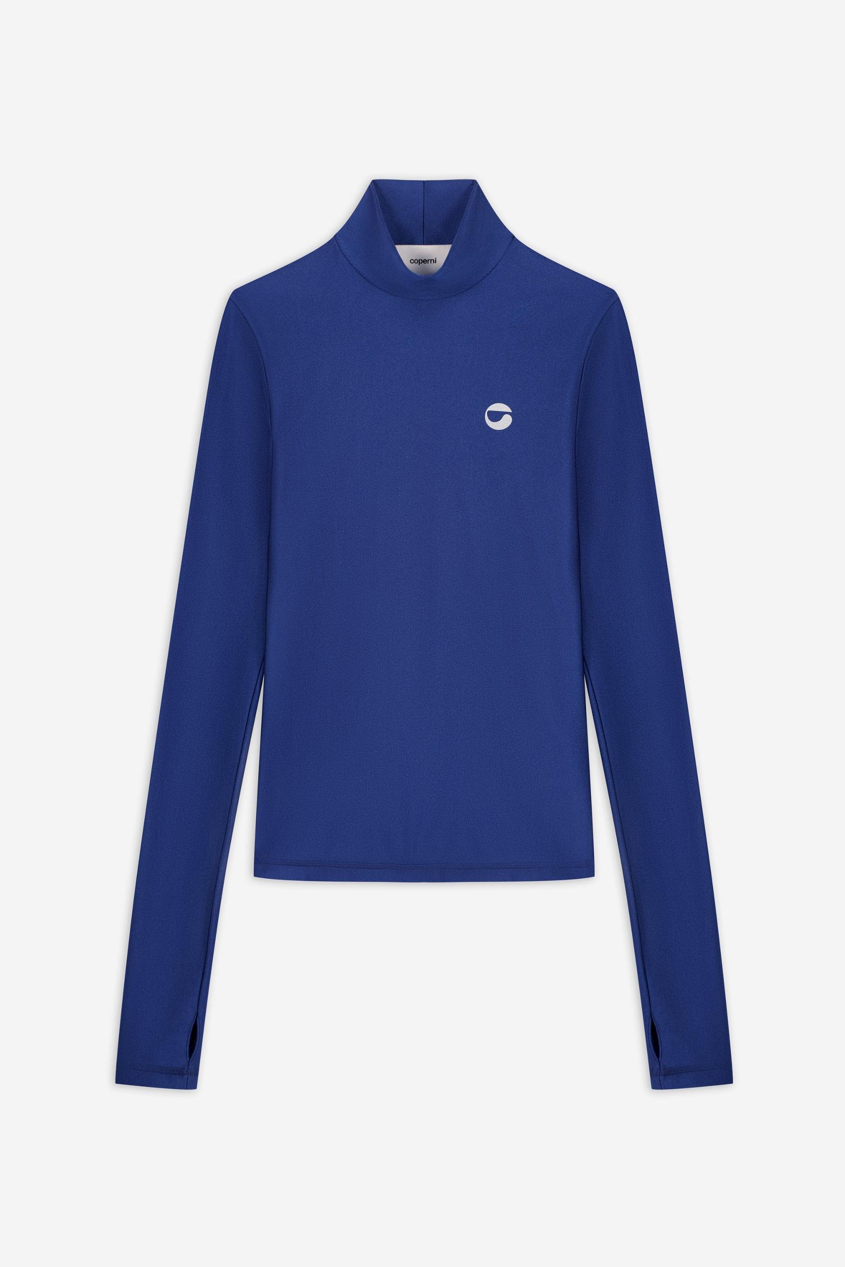 This stretch turtleneck in a vivid blue hue features a discreet Coperni logo integrated at the chest, balances boldness and subtlety. Lightweight and sculpting, it offers a visual impact with everyday ease.