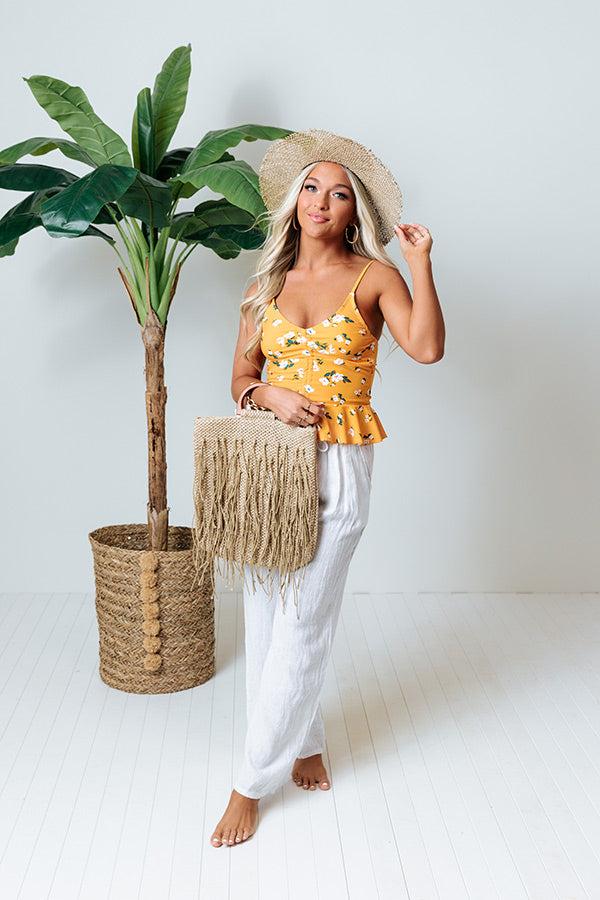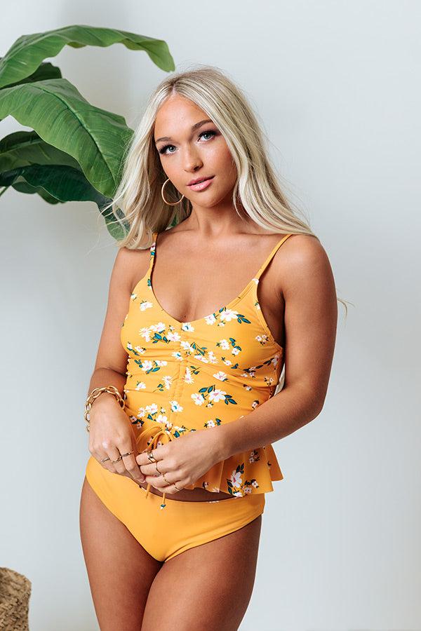 Summer's on its way! Get ready for warmer weather with our charming marigold colored 'Secret Beach' tankini featuring lightweight four-way stretch material patterned with a bold white and green floral print, a ruched front bodice with removable padding and a tie closure, a scooped v-cut neckline with adjustable spaghetti straps, and a flattering form fitting silhouette that ends in a ruffled peplum hemline! Measurements S : Int Cup A-C", Int Width 32-34". M : Int Cup B-D", Int Width 34-36". L : Int Cup B-D", Int Width 36-38".