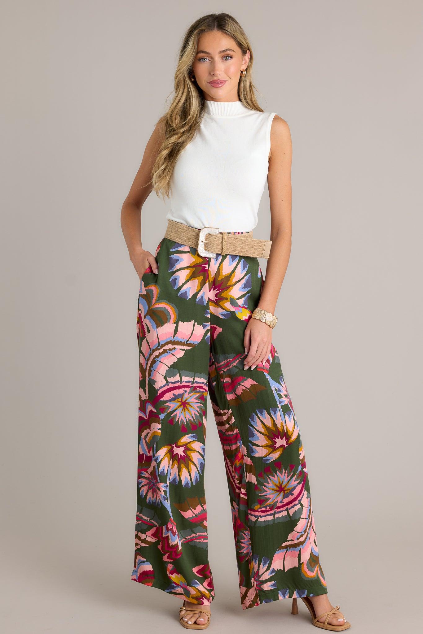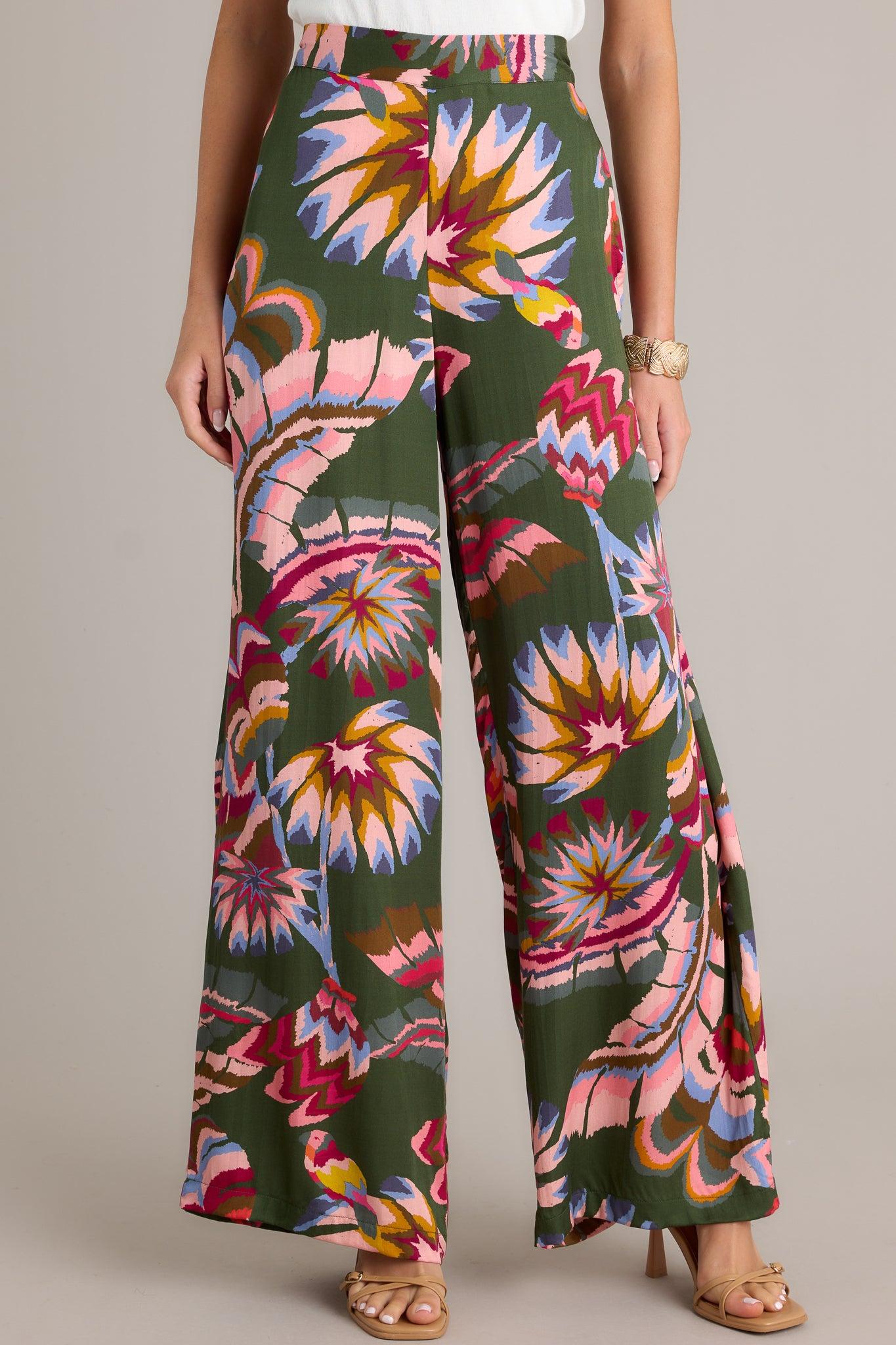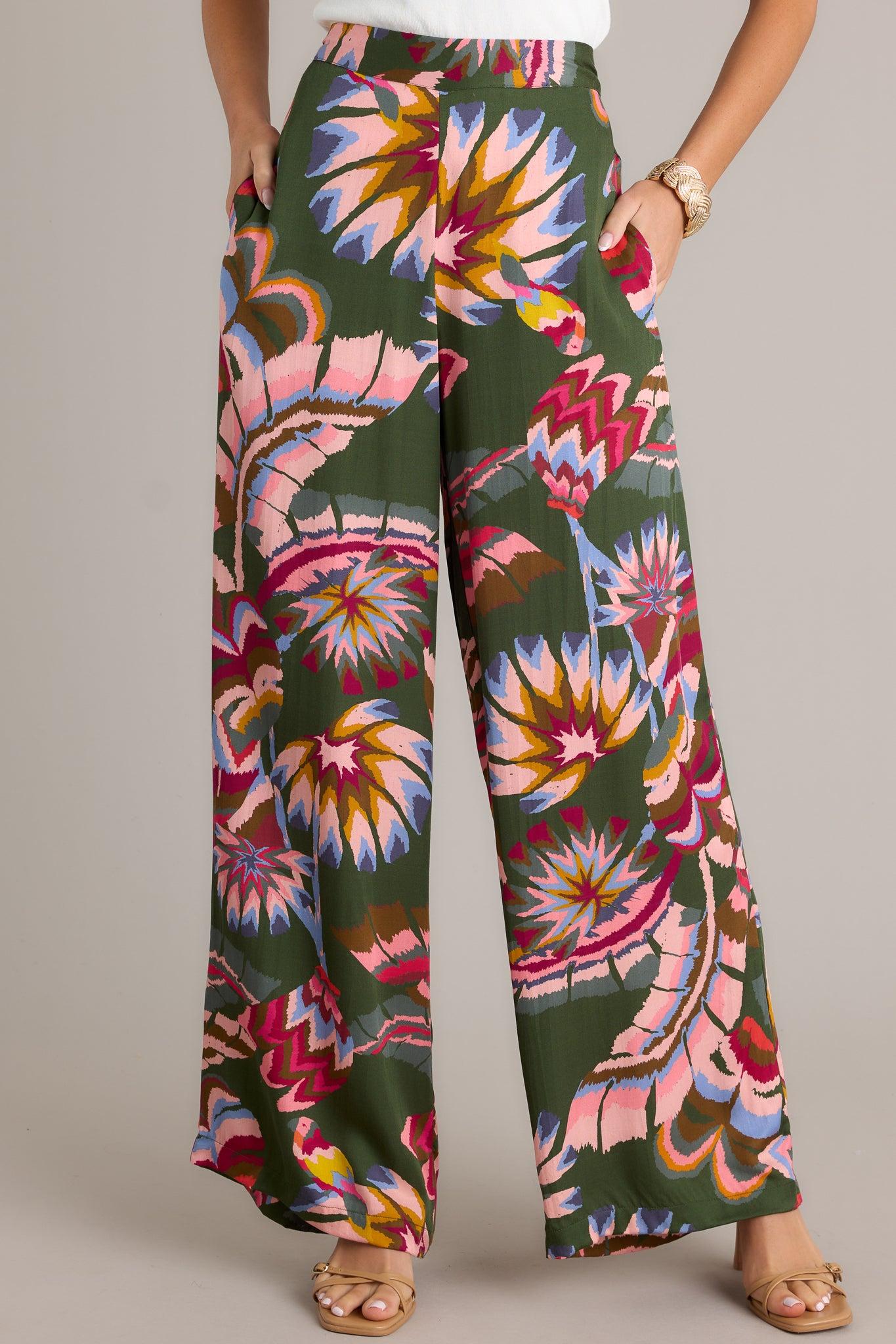 Go wide or go home with these Secret Willow Green Multi Wide Leg Pants. Perfect for any occasion, these pants offer a flattering and comfortable fit, while the unique willow green color adds a touch of whimsy to your wardrobe. A secret no more, these pants will make you stand out in style. (Seriously, go get them now!) These green multi pants feature an elastic waist insert, deep functional hip pockets, a wide leg and a soft breathable fabric. 100% Modal Unlined Hand Wash Cold Manufactured in India Designed in The USA Model is wearing a size small