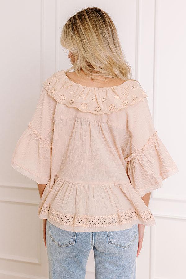 - Step into the sweet side of style with this darling top! The eyelet accents and flowy fit bring all the charm, making it a must-have for an effortlessly cute look. - Unlined lightweight material - A v-cut neckline featuring a scalloped eyelet collar - Short, loose sleeves with ruffle accents - Six buttons to secure the front - A relaxed silhouette that ends in an unfinished, high-low peplum hemline featuring eyelet accent trim