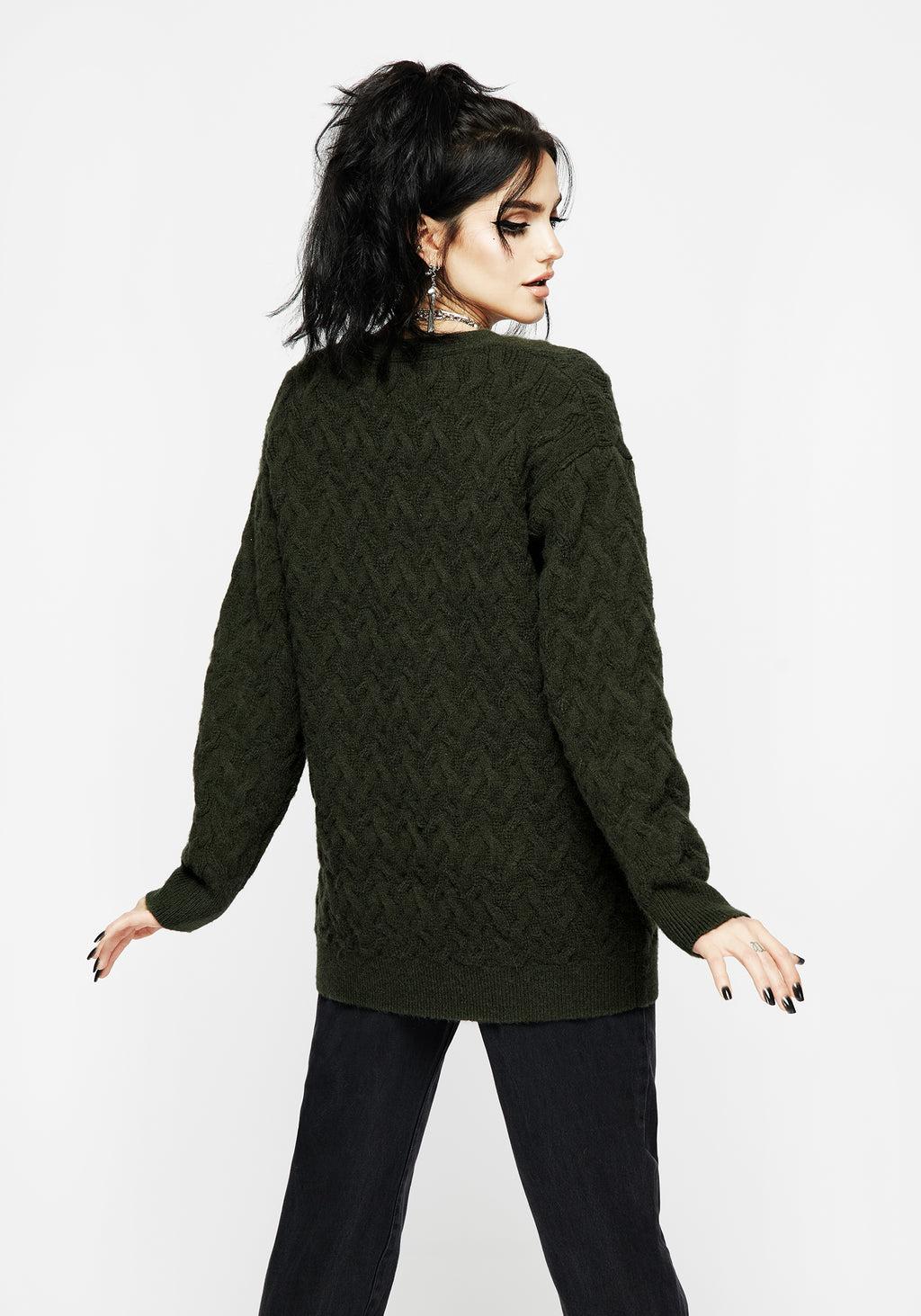 Become the sweet forest faery you were destined to be- Green mushroom embroidered cable knit cardigan - Comfy oversized fit with a longline length - Wide V-neckline & roomy long sleeves make this a dream to layer - Button-up front with gunmetal buttons - Two handy side patch pockets - Thick cable knit fabrication in an earthy green shade - Chunky mushroom & leaf embroidery on front - Your new favourite grungy knit for earthy ‘fits - Going to forest in the woods for supplies, y’all need anything? 46% acrylic, 32% polyester, 22% polyamide