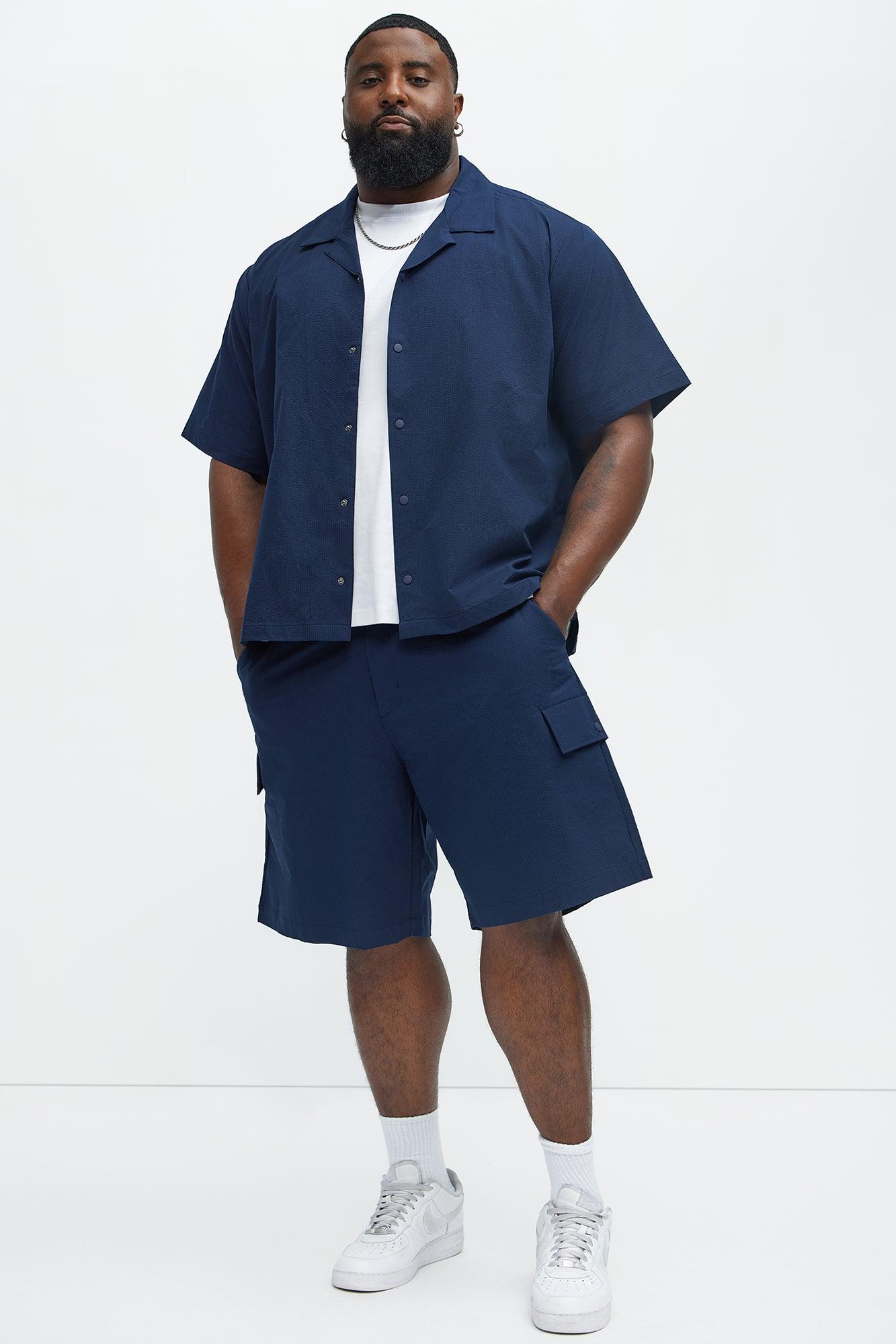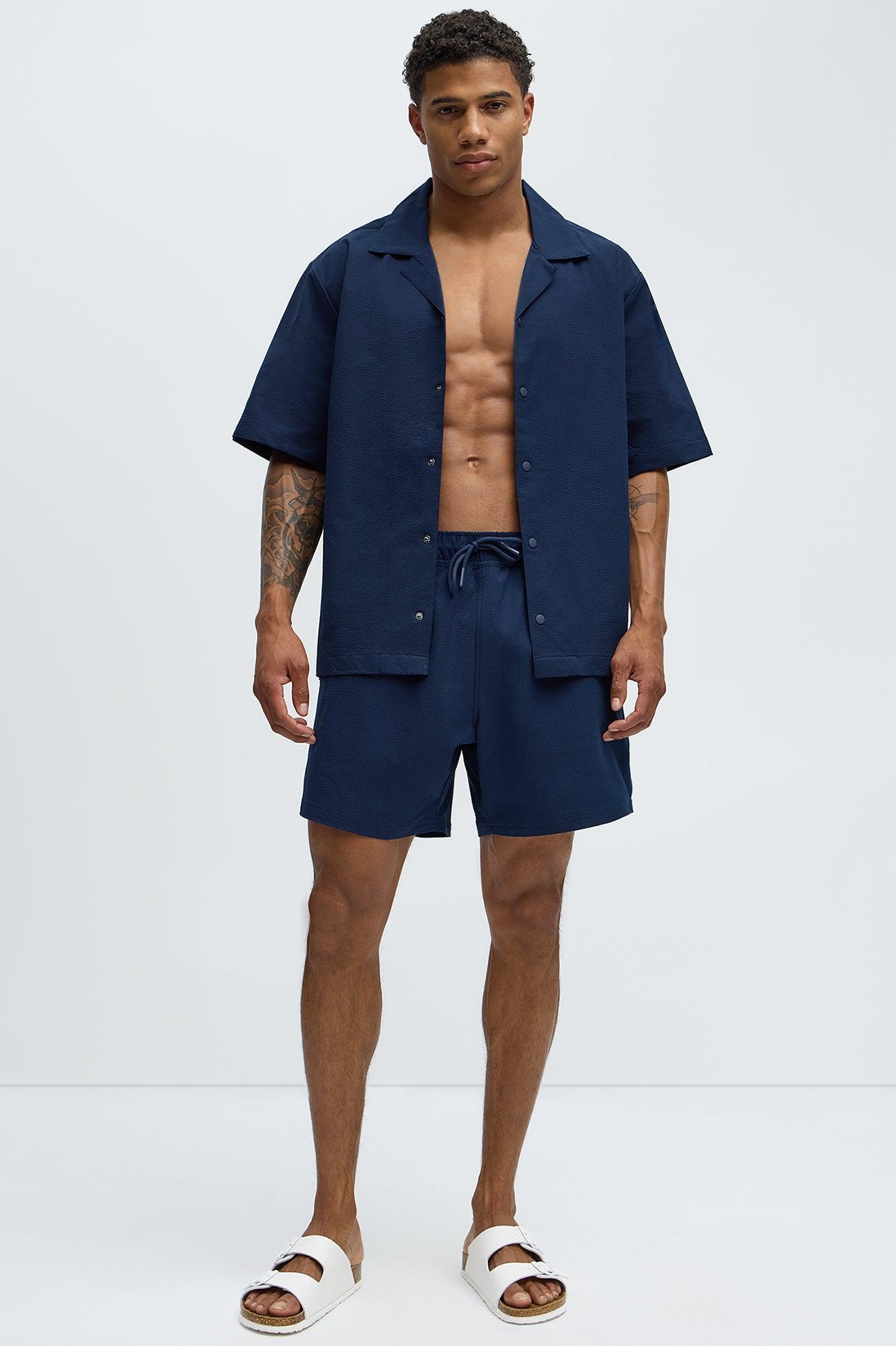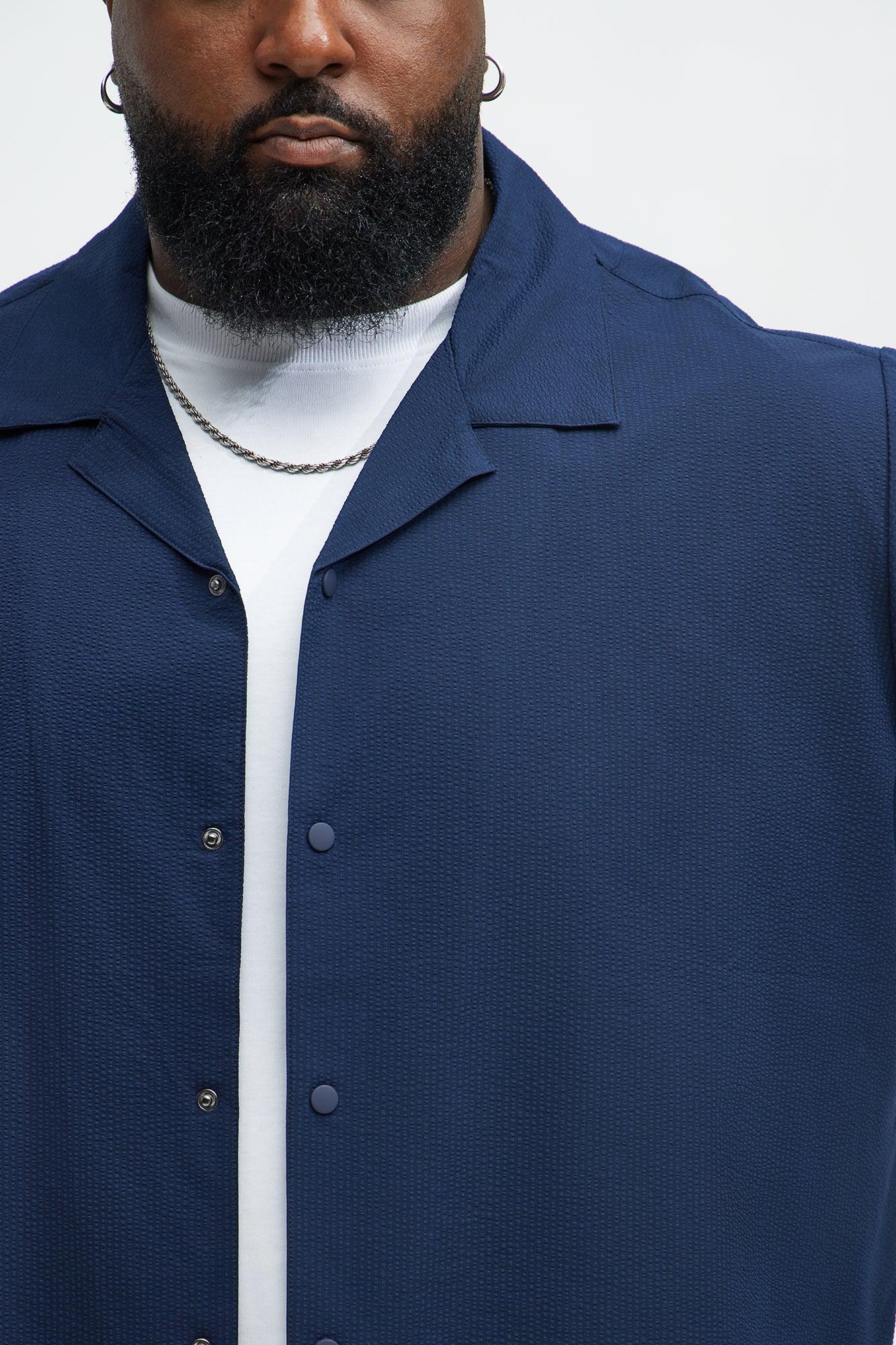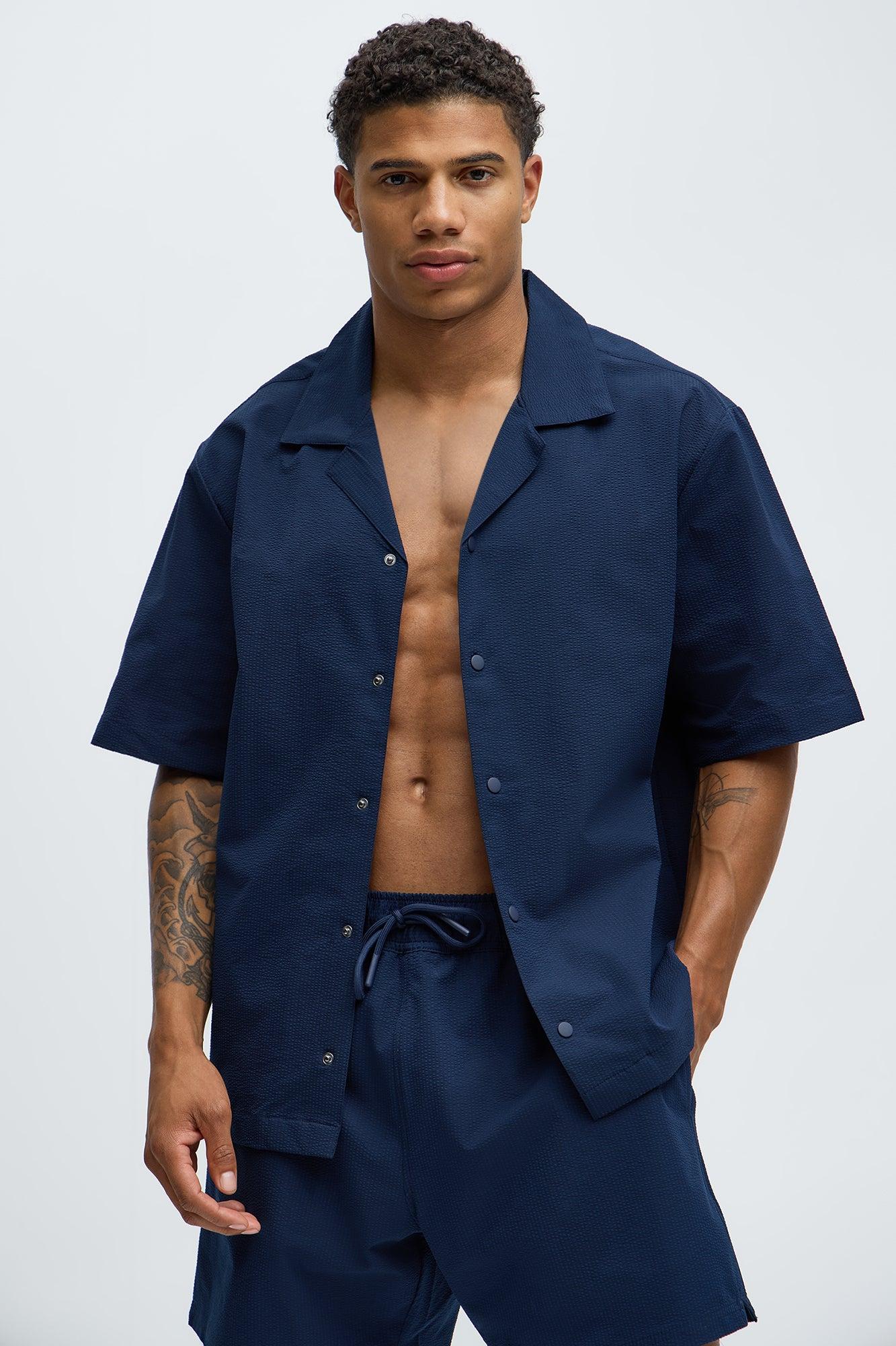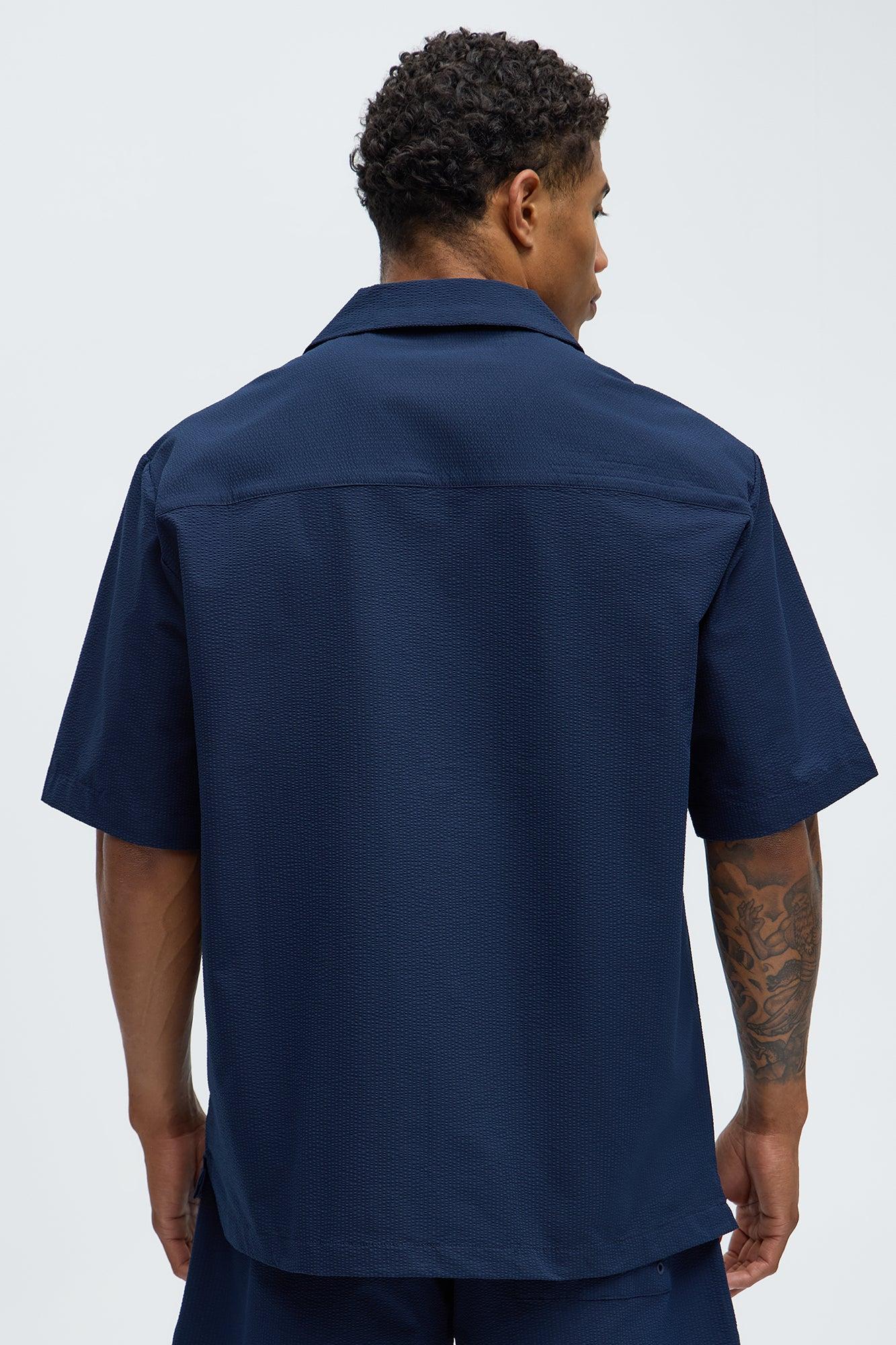 Seersucker Short Sleeve Cuban Collar Shirt - Navy