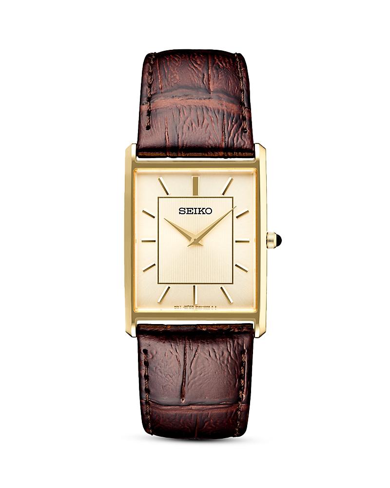 Light Champagne dial enhanced by gold-tone hands. Gold-tone stainless steel case with a brown leather band. Quartz movementu00a0u00a0 30 meters / 100 feet water resistanceu00a0u00a0 Fixed bezelu00a0u00a0 Scratch Resistant Mineral crystalu00a0u00a0 Solid casebacku00a0u00a0 Tang claspu00a0u00a0 Pull / Push crownu00a0u00a0 Case size 27.9 mmu00a0u00a0 Seiko SWR064 Essentials Watch. Seiko Essentials Quartz Champagne Dial Watch SWR064 in Brown, Mens at Urban Outfitters