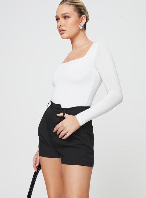 High rise shorts Belt looped waist, zip and clasp fastening, twin hip pockets, subtle pleats at waist Non-stretch, unlined 96% polyester 4% elastane Cold gentle machine wash