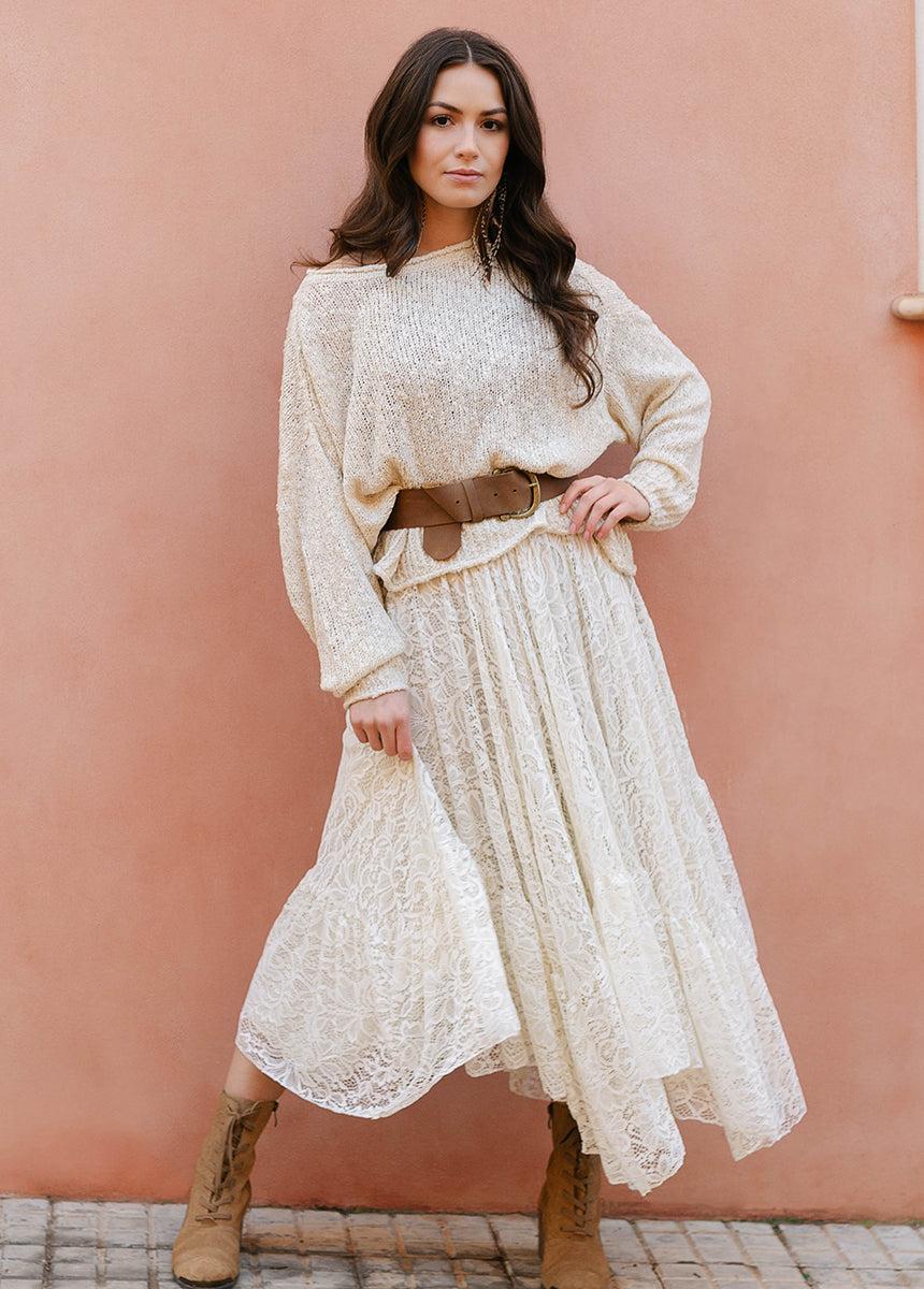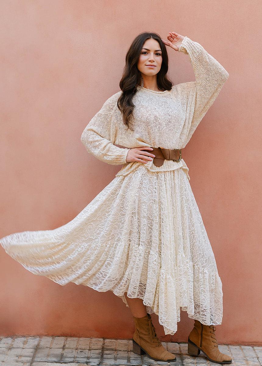 Inspired by our beloved Poesy Dress, this elegant midi-length skirt combines style and comfort in one beautiful piece. Featuring a unique irregular hemline and delicate lace accents, it adds a feminine, romantic touch to any outfit. The elastic back waist ensures a flattering and comfortable fit, while the short-length lining provides coverage and ease of movement. Perfect for both casual and dressy occasions, this skirt offers effortless versatility. Midi length Irregular hemline Elastic back waist Short length lining Self: 90% Nylon, 10% Spandex // Lining: 100% Polyester Hand wash only, line dry