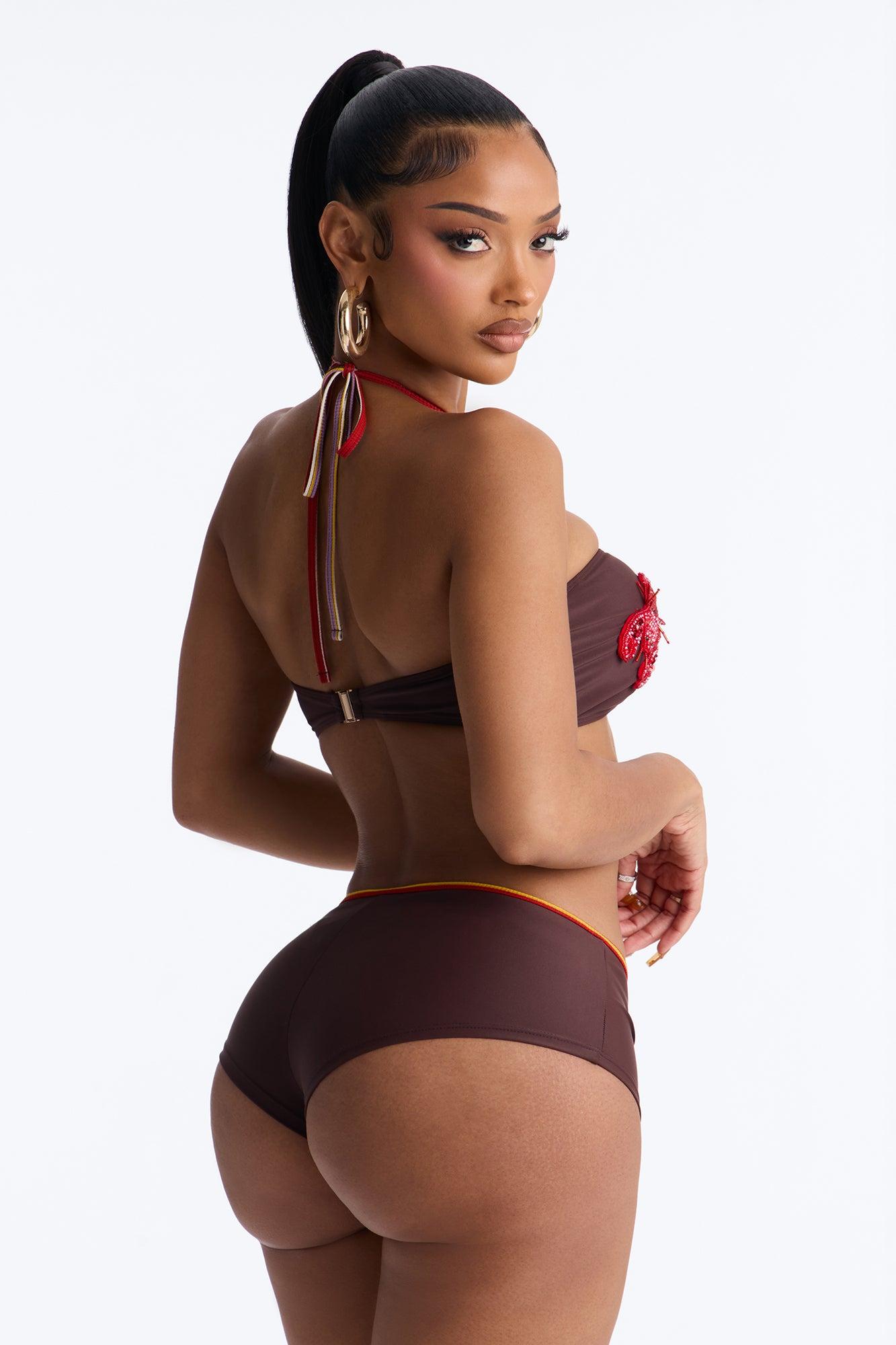 Available In Brown. 3 Piece Bikini Set Beaded Flower and Sun Detail Halter Bandeau Top Side Strap Bikini Bottom Thong Boyshort Cover Up Boyshorts Final Sale Self/Lining: 84% Nylon 16% Spandex Contrast: 75% Rayon 20% Polyester 5% Spandex Imported Available In Plus Sizes