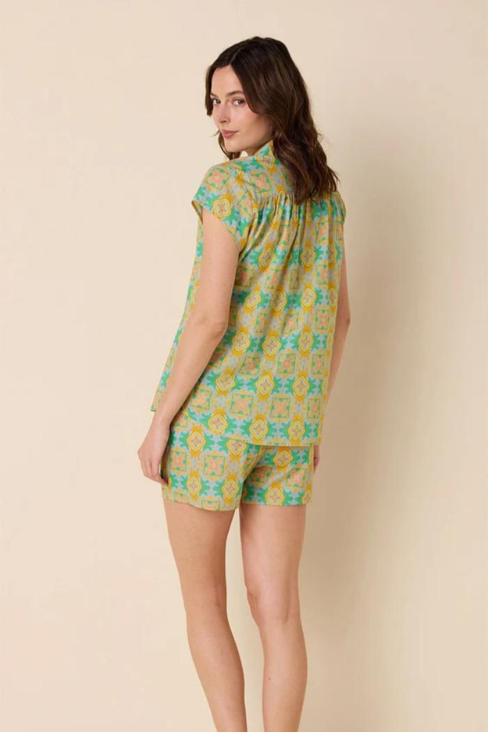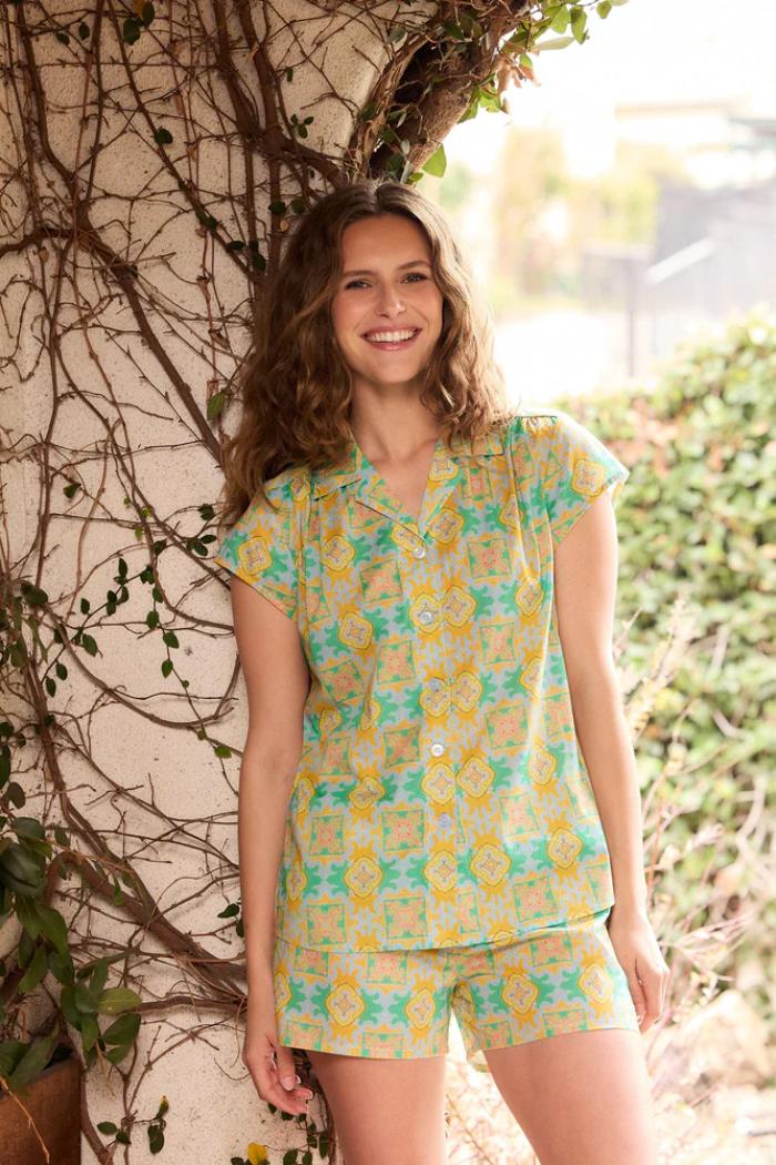 Pajama top has cap sleeves with ruching detail at the shoulder