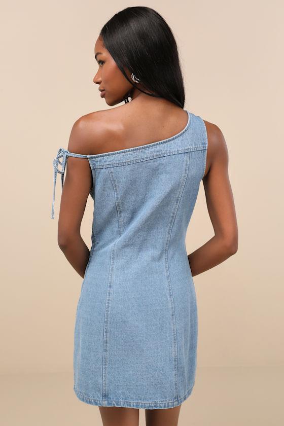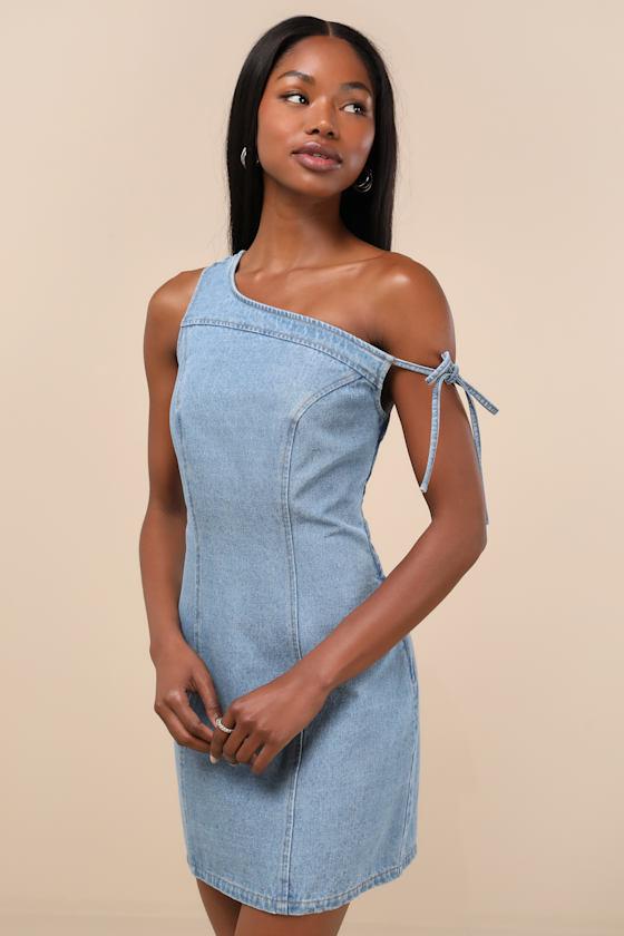 Denim has always been a neutral, which means that this lil' dress is a must-have to be the basis for a variety of trend-setting looks. The sheath silhouette features an asymmetrical design with a wide strap and a slender tying strap, creating a trendy one-shoulder effect atop a flirty mini hem that completes the look. Hidden side zipper/clasp.