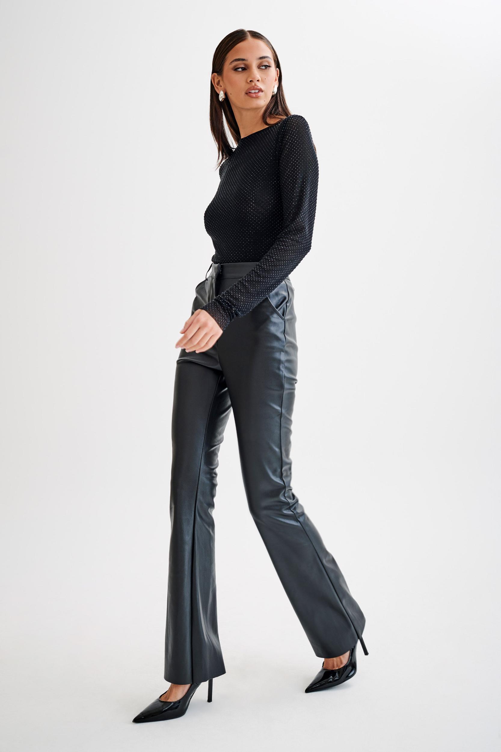 After-dark. Adorned with head-turning rhinestones, SELMA is a long-sleeved bodysuit made for style and comfort. The high crew neck and back zipper offers maximum coverage up top without taking away from the curve-hugging fabric and flattering cheeky cut. It’s the perfect party top for when you want a snug, unmovable tuck. Pair with MESHKI Denim or our signature Tyra Straight Leg Faux Leather Pants for an unforgettable look.