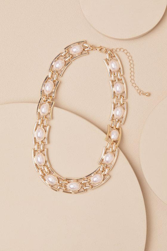 Create a luxe and eye-catching aesthetic with total ease thanks to this luminous necklace, which boasts a perfectly chunky choker-style silhouette. Shiny, gold-toned metal crafts an intricate chain link design with gleaming, oblong-shaped faux pearl centers for a mesmerizing finish.