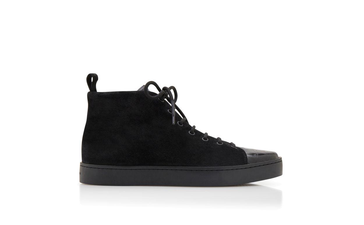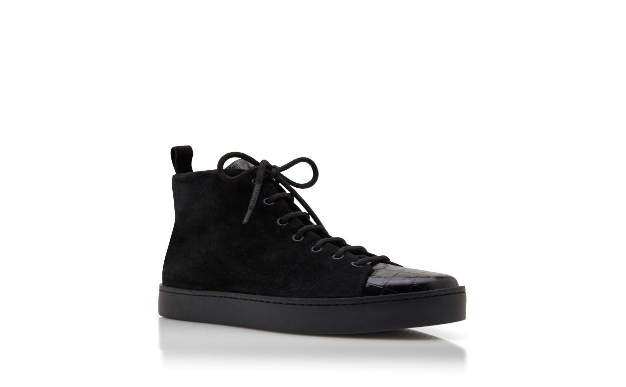 Black calf leather lace up sneakers featuring high top design, rear pull tab and animal print design. Finished with white rubber sole.