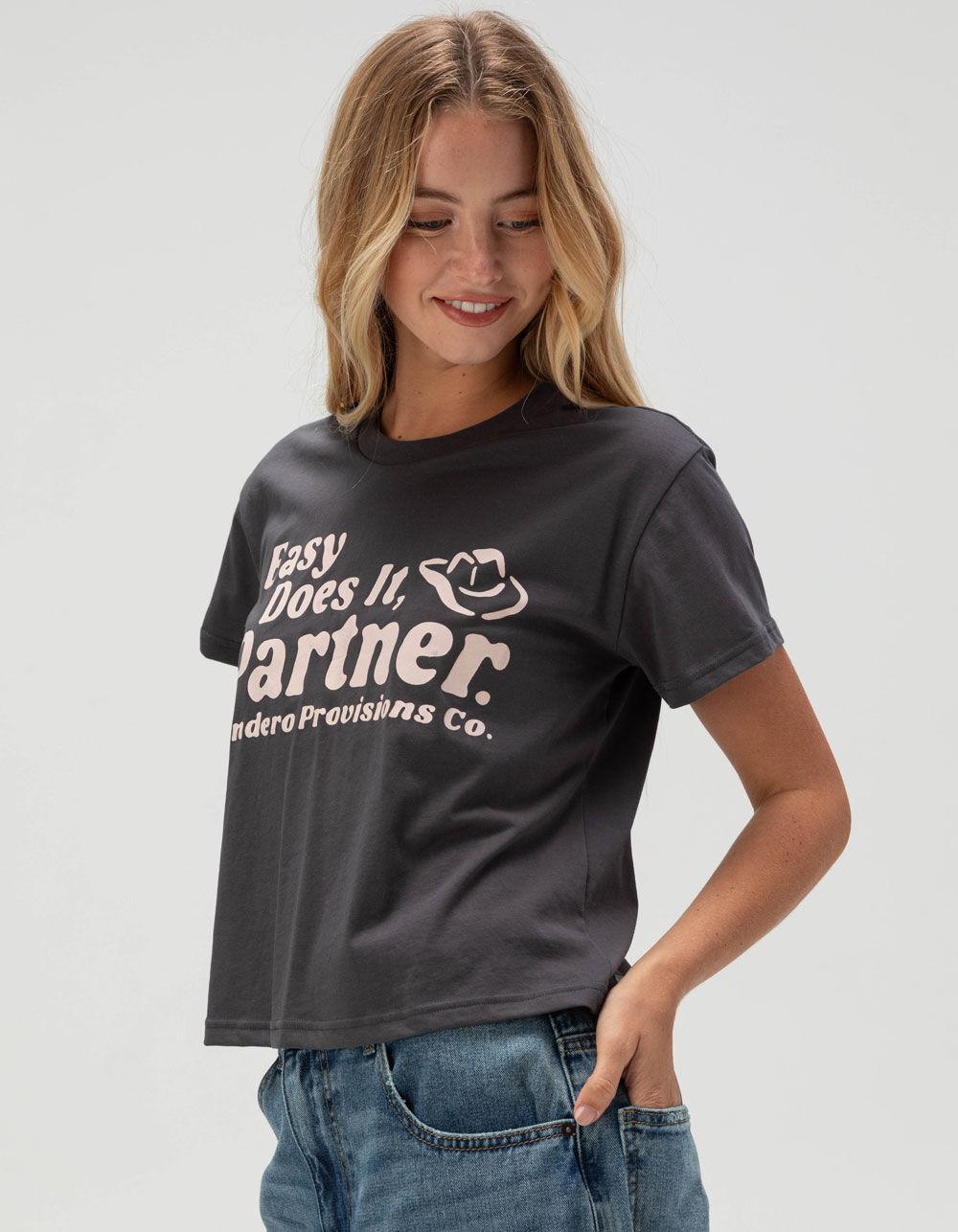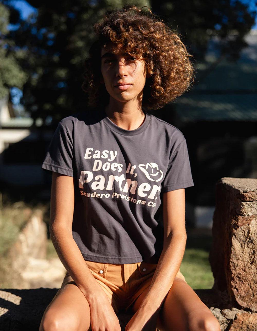 Sendero Provisions Co. Easy Does It Crop Boxy Tee. Graphic screened on front. Woven label at hem. Cropped length. Boxy fit. Crew neck. Short sleeve. 60% Organic Cotton 40% Polyester. Machine wash. Imported.