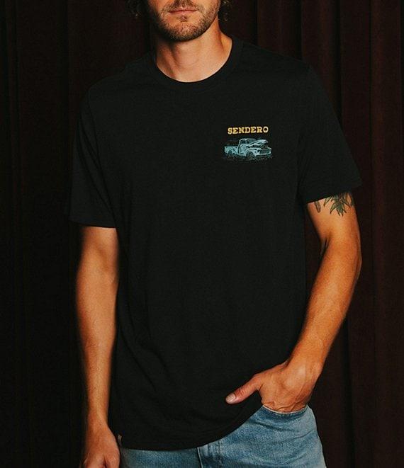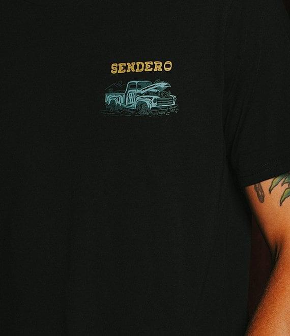 From Sendero Provisions Co., this t-shirt features: Crew neckline Short sleeves Truck graphic and "Sendero Provisions Co." logo on the chest "Few Parts" verbiage, a truck graphic and "she'll fix right up" verbiage and logo screen print on the back Pullover construction Ultra-soft cotton/polyester Machine wash/tumble dry Imported.