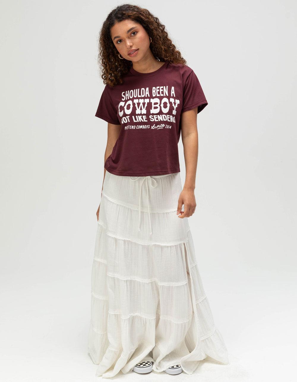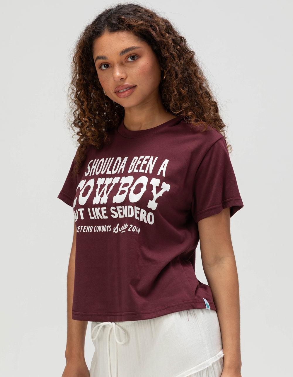 BURGUNDY. Sendero Provisions Co. Shoulda Been A Cowboy Crop Boxy Tee. Large text screened on front. Cropped length. Boxy fit. Reinforced neck seam tape. Crew neck. Short sleeve. 60% Organic Cotton 40% Polyester. Machine wash. Imported.