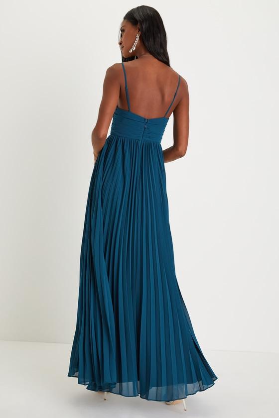 Whenever you wear the Lulus Sensational Charmer Teal Blue Pleated Sleeveless Maxi Dress, you'll just know you look fabulous! Lightweight pleated woven chiffon shapes this ultra-elegant dress that starts with a sleeveless bodice (with a flattering ruched detail at the center) and a V-neckline, supported by adjustable spaghetti straps. The fitted waist tops a breezy, A-line maxi skirt that continues down to a sweeping maxi hem. Hidden back zipper/clasp.