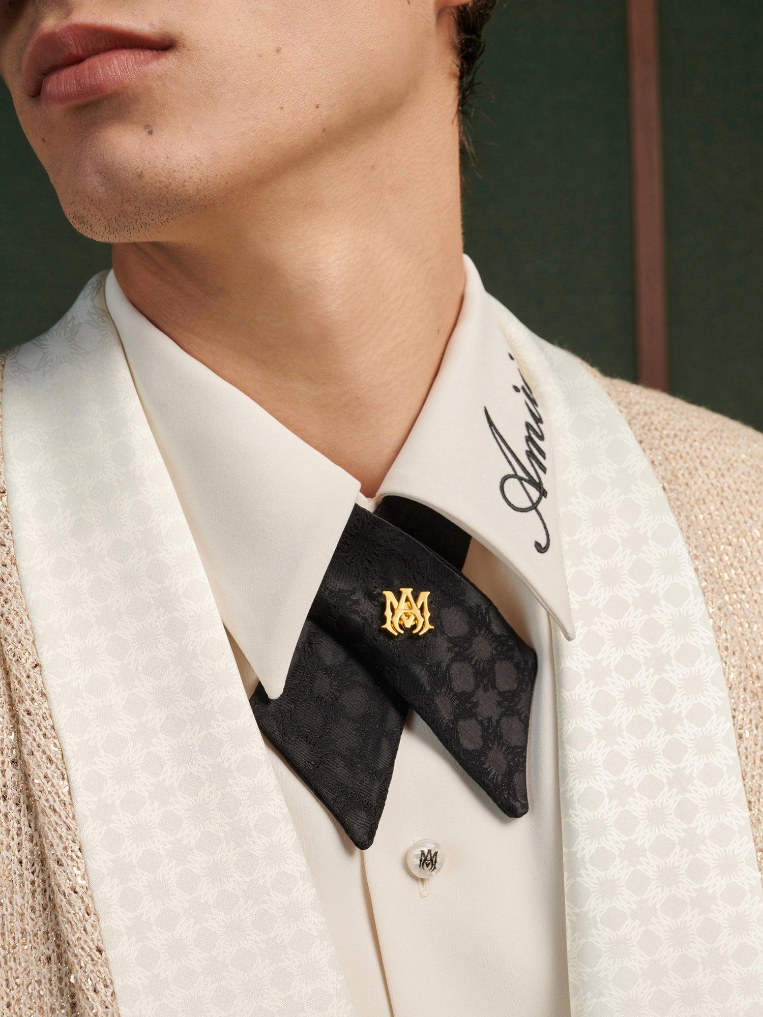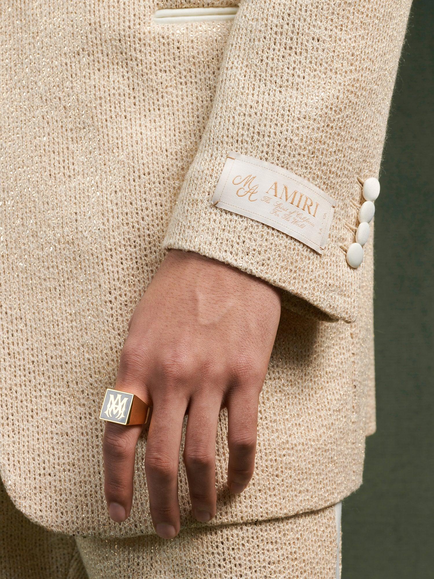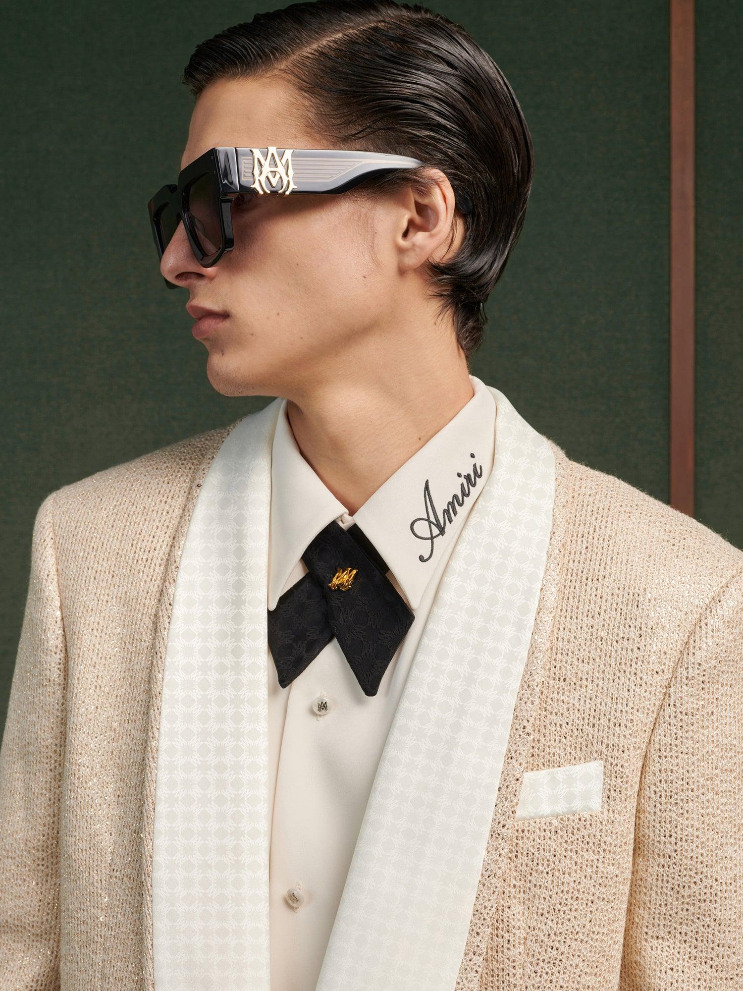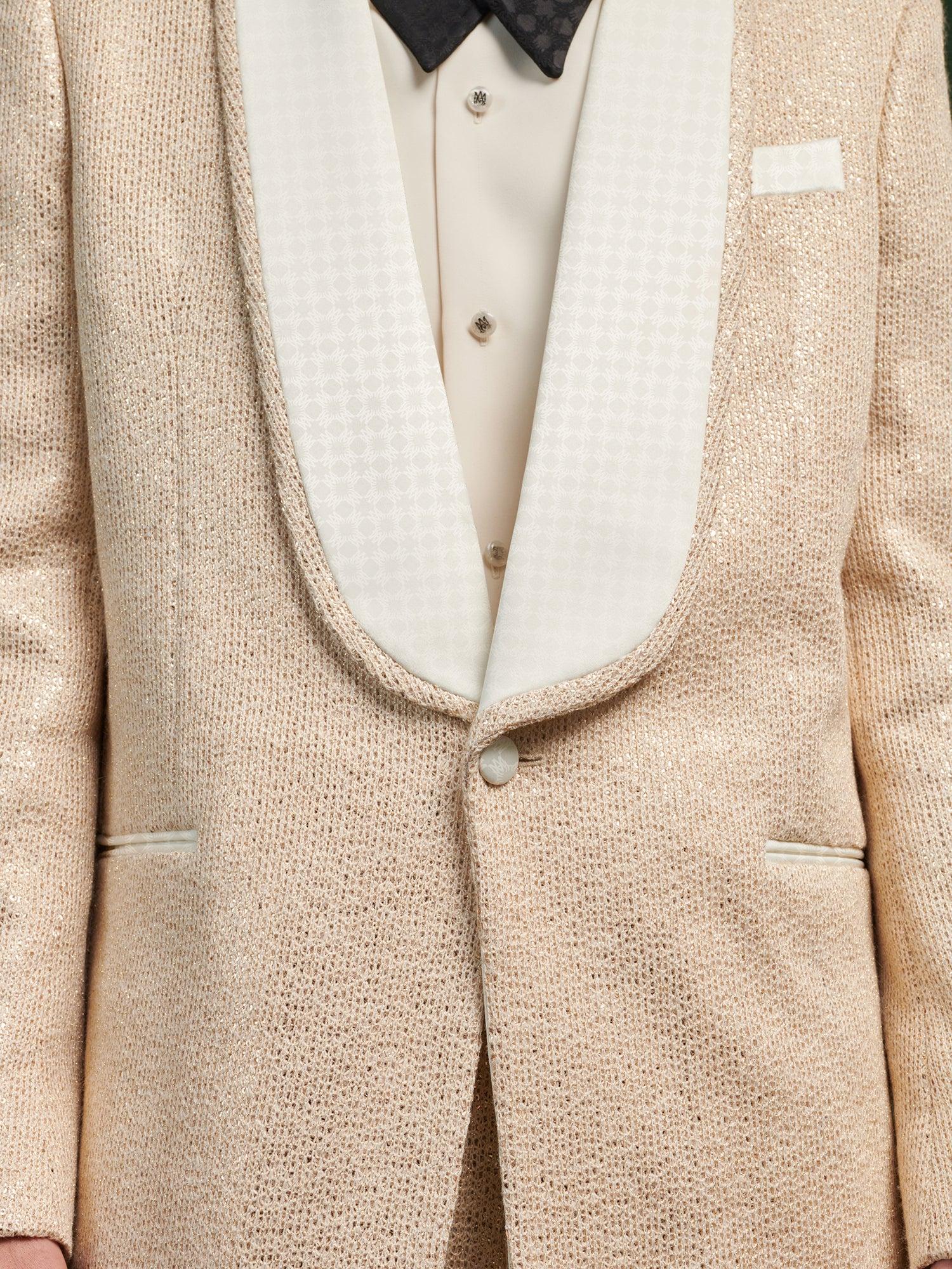 Time-honored bouclé is made memorable with sequins in suiting silhouettes steeped in the visual language of America's mid-century. The Sequin Bouclé Shawl Blazer is designed with a contrast lapel, welt pockets, and covered button closure. SPRING-SUMMER 2025 COLLECTION MADE IN ITALY 100% POLYESTER