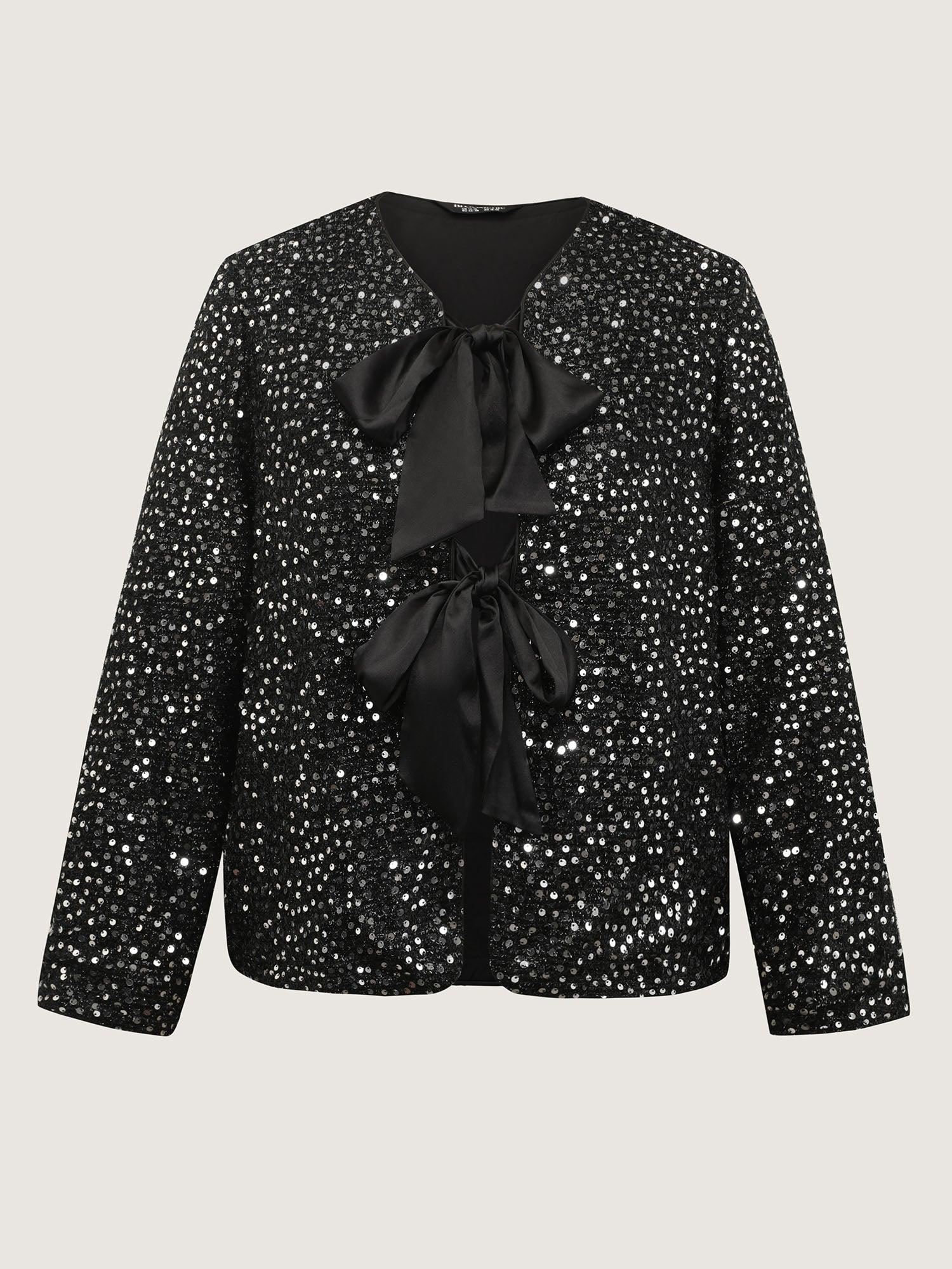 Shop Sequin Bowtie Cropped Coat now and redefine your style with confidence at BloomChic. Tailored for mid and plus-size women. This trendy Outerwear Women, sizes 10-30. Color:Black;Prints:Non;Details:Tie knot;Pocket:Side seam pocket;Belt:No-belt;Closure Type:Open front without closure;Lining:Lining