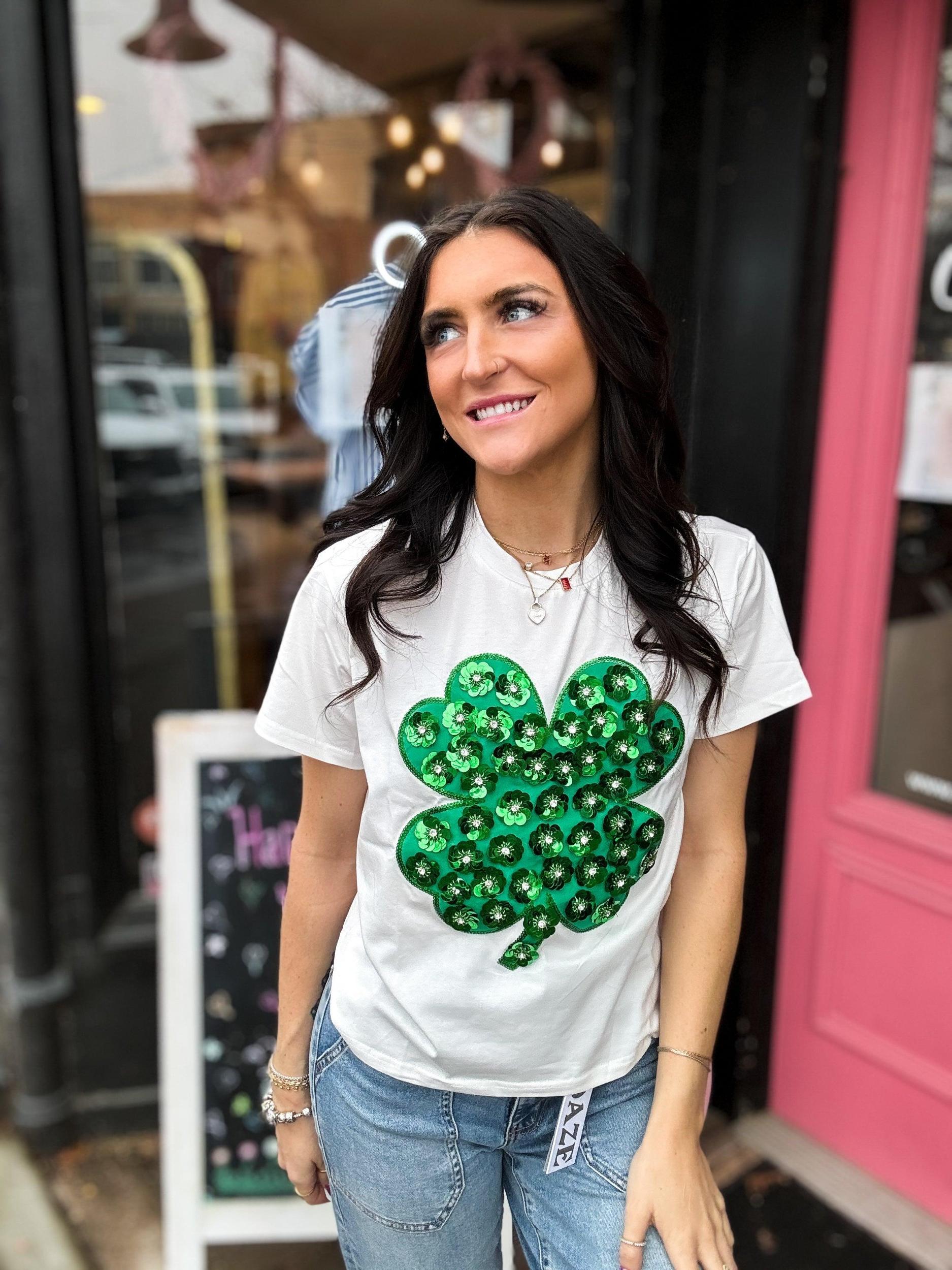 Get ready to sparkle this St. Patrick's Day with our Sequin Flower Shamrock Tee! This Queen of Sparkles white short sleeve tee features a shamrock made of flower sequins, perfect for the Queen in your life. You'll be the center of attention and the life of the party, so grab yours now!