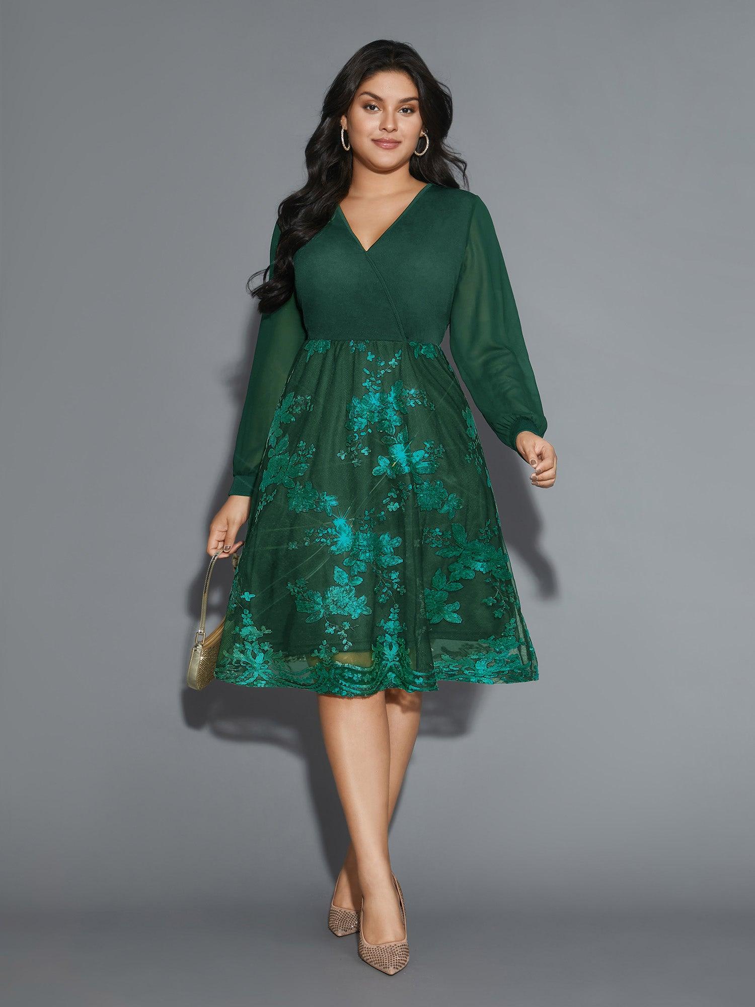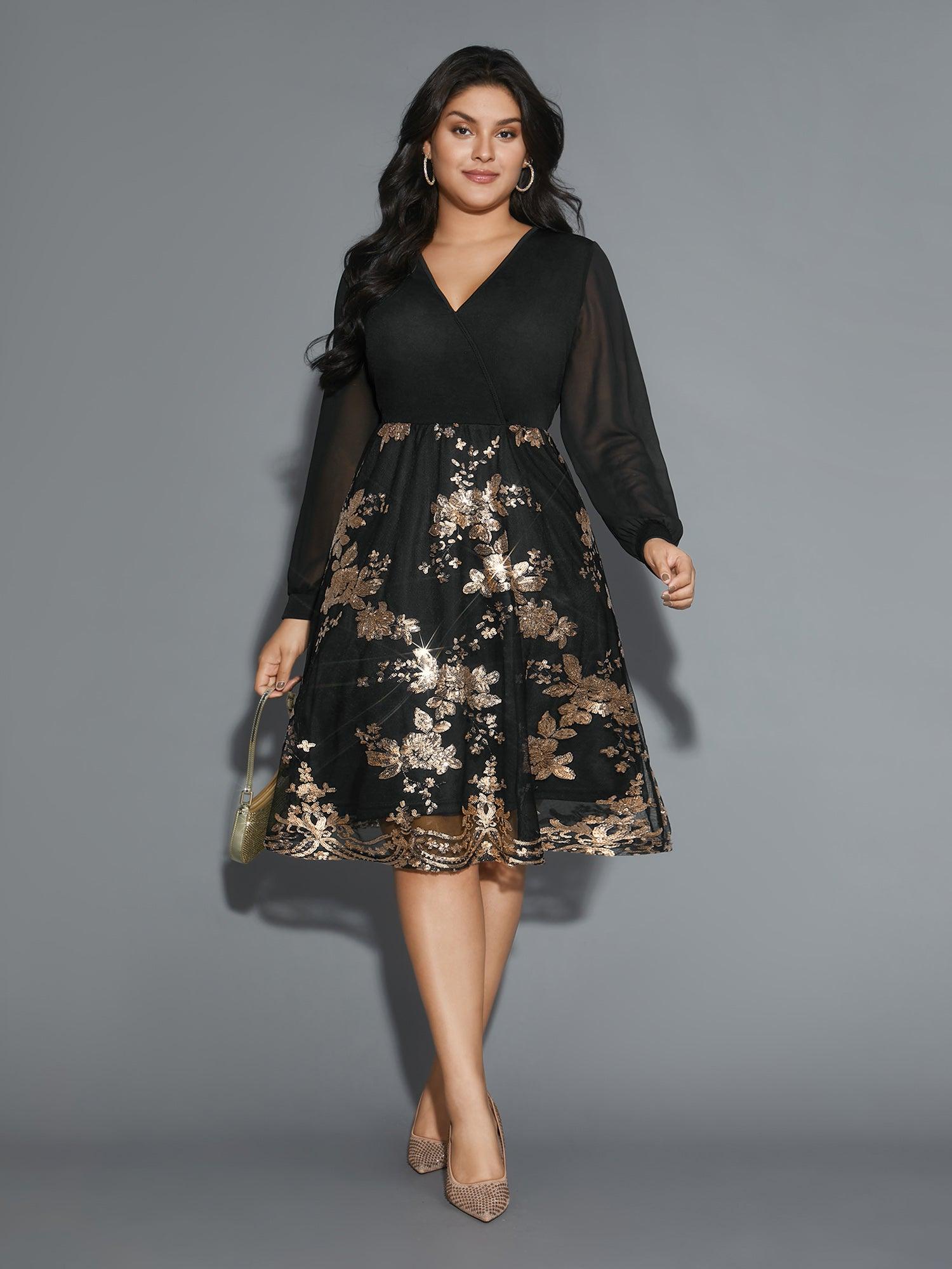 Sequin Overlap Collar Sheer Sleeve Lined Dress Female