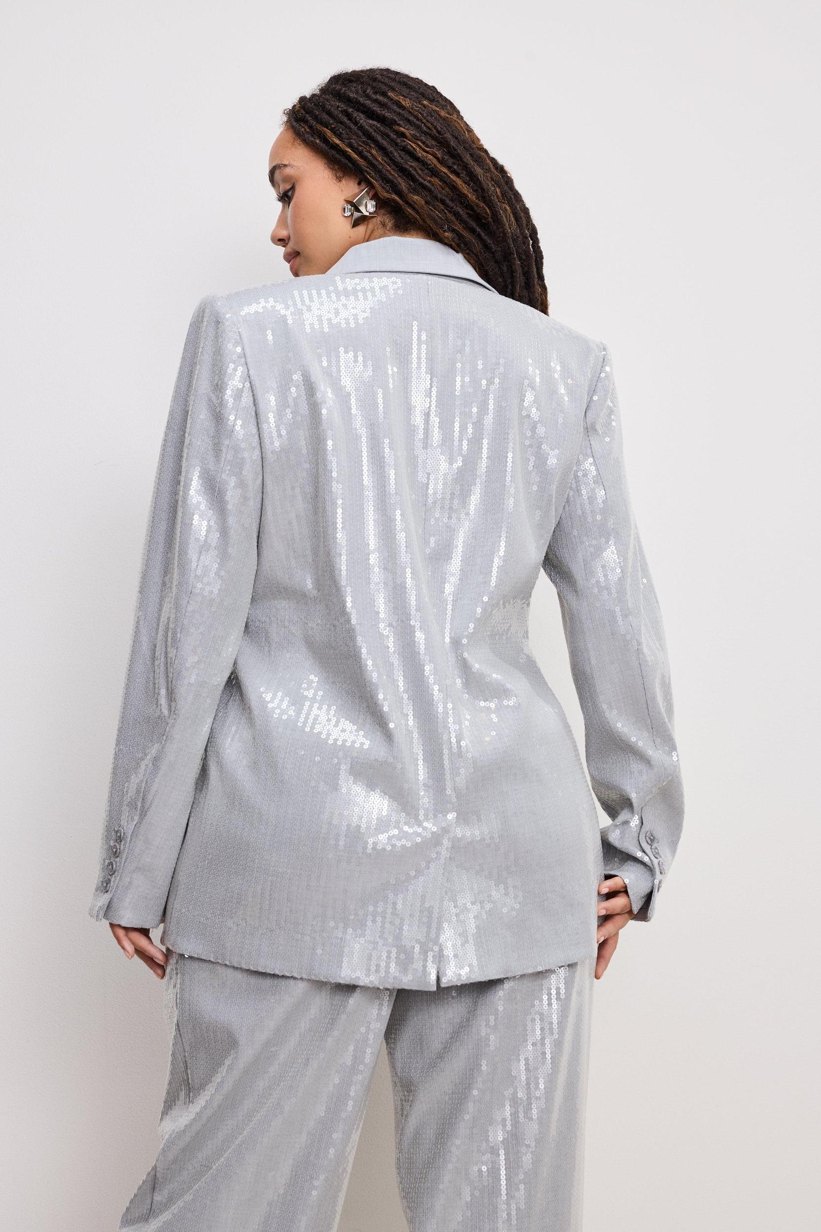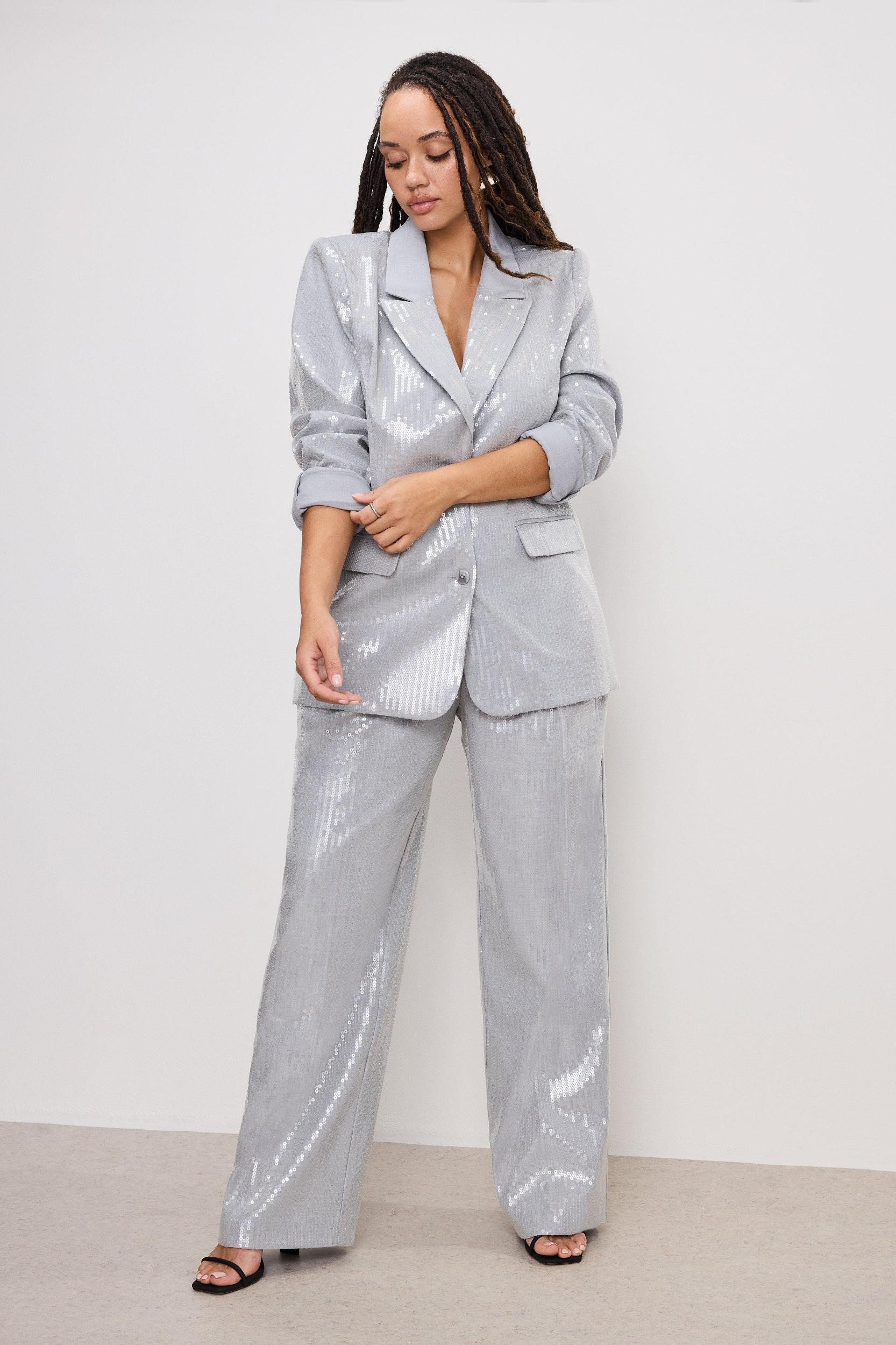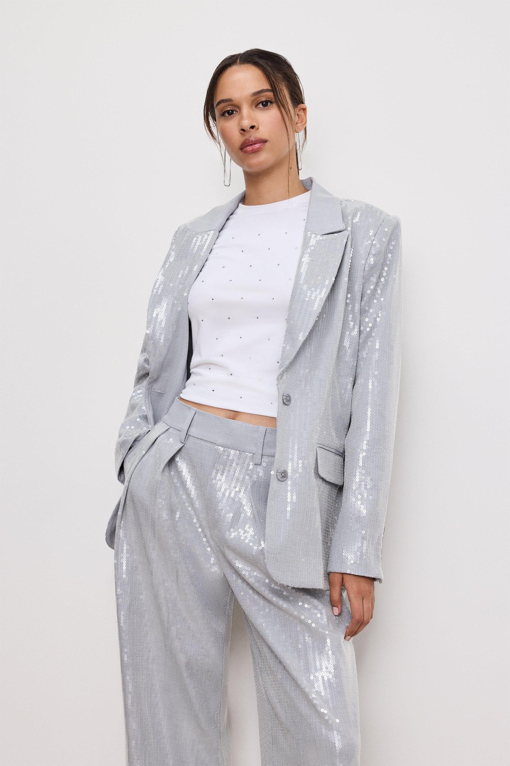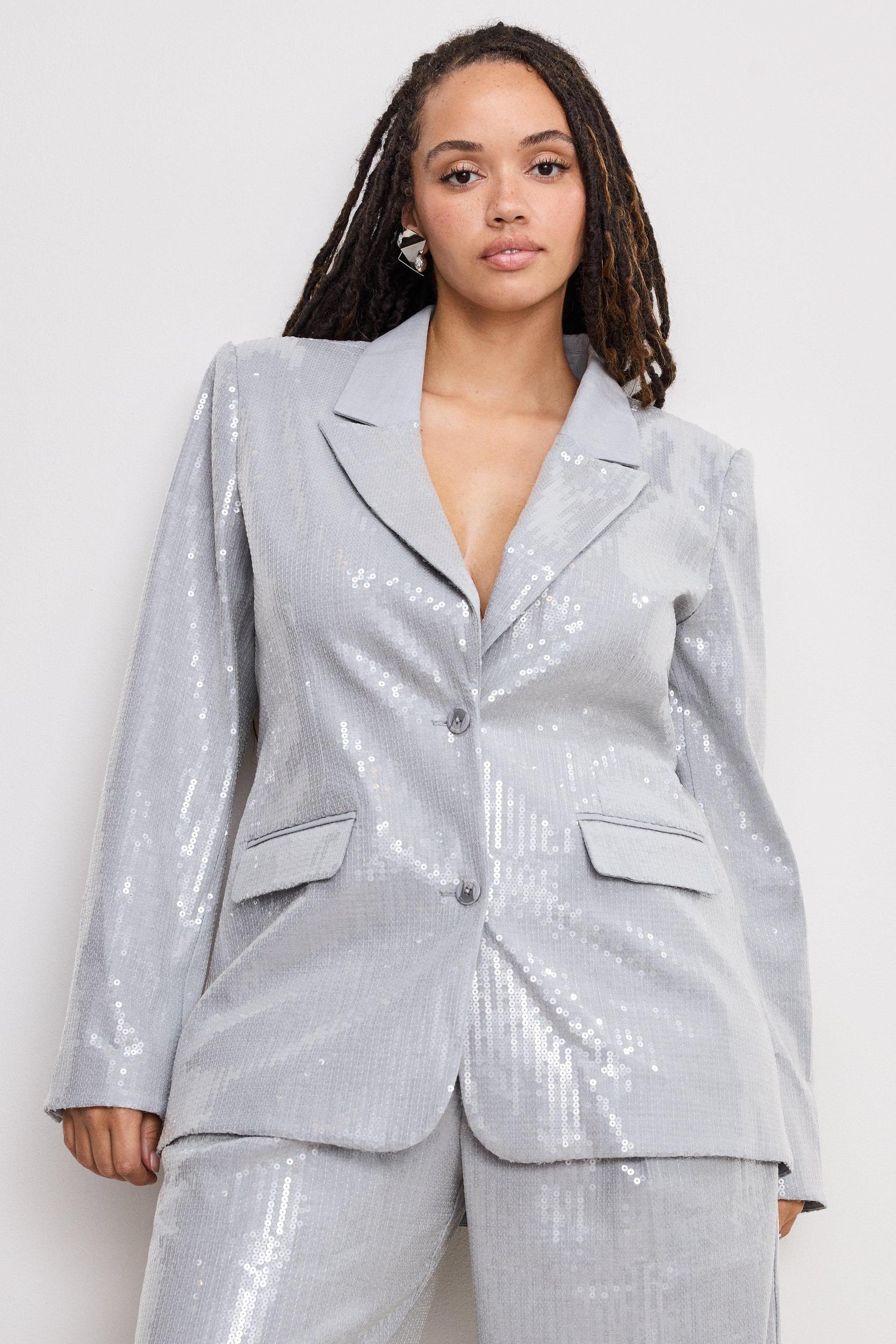 Stand out and shine bright in the Sequin Oversized Blazer. Coated with sequins, it makes a high-shine statement with padded shoulders and an oversized fit for the perfect amount of structure and style. Crafted from our crosshatch fabric and lined with satin, it offers breathable comfort and lightweight wear. Notched lapel collar Front button closures Side welt pockets Long sleeves Fabric: 68% Rayon, 27% Nylon, 5% Spandex Care: Hand Wash Cold Inside Out, Lay Flat to Dry Model size 0 is 5’7 and wearing size XS
