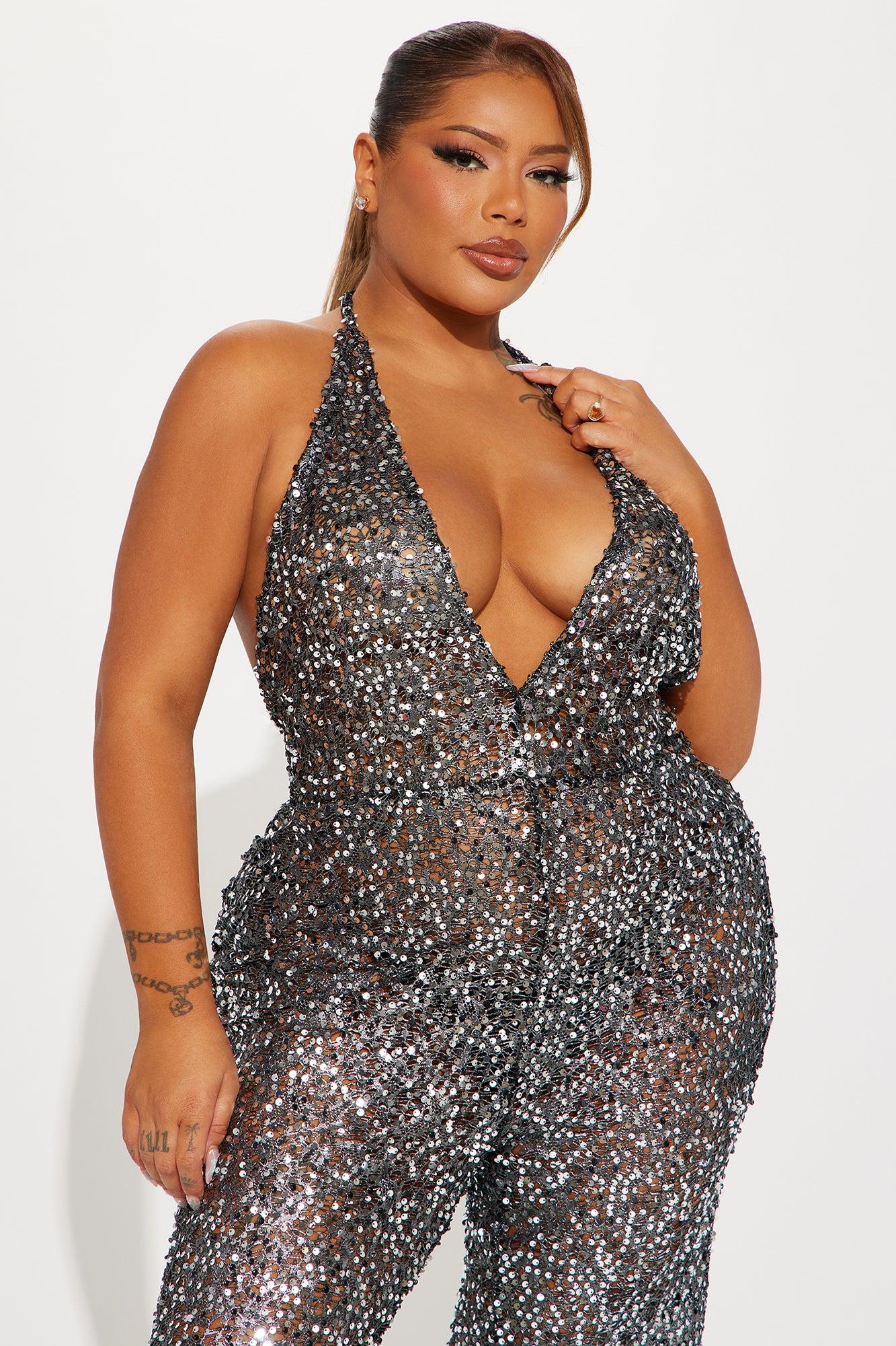 Available In Silver. Cover Up Jumpsuit Sequin Crochet Halter Neck Ties Backless Full Stretch Final Sale 100% Polyester Imported California Proposition 65 WARNING: Cancer and Reproductive Harm - www.P65Warnings.ca.gov.
