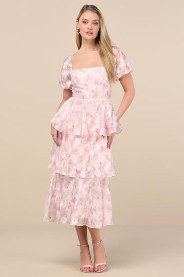 Days spent in the Lulus Serah Blush Floral Organza Tiered Midi Dress will be filled with admiring looks and feeling too cute! Airy woven organza boasts a floral burnout design and a sweet floral print throughout as it shapes short puff sleeves (with elastic at the shoulders and cuffs) and a princess-seamed bodice with lace-up detailing across the open back. The fitted waist tops a tiered A-line skirt that finishes at a midi hem. Hidden back zipper/clasp.