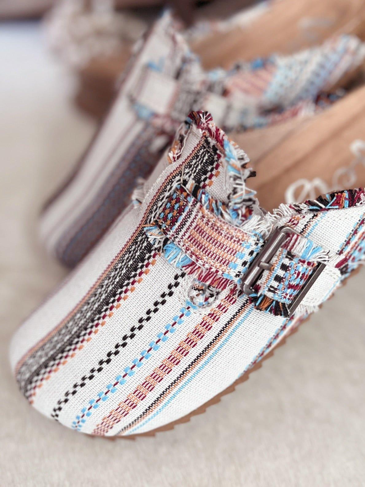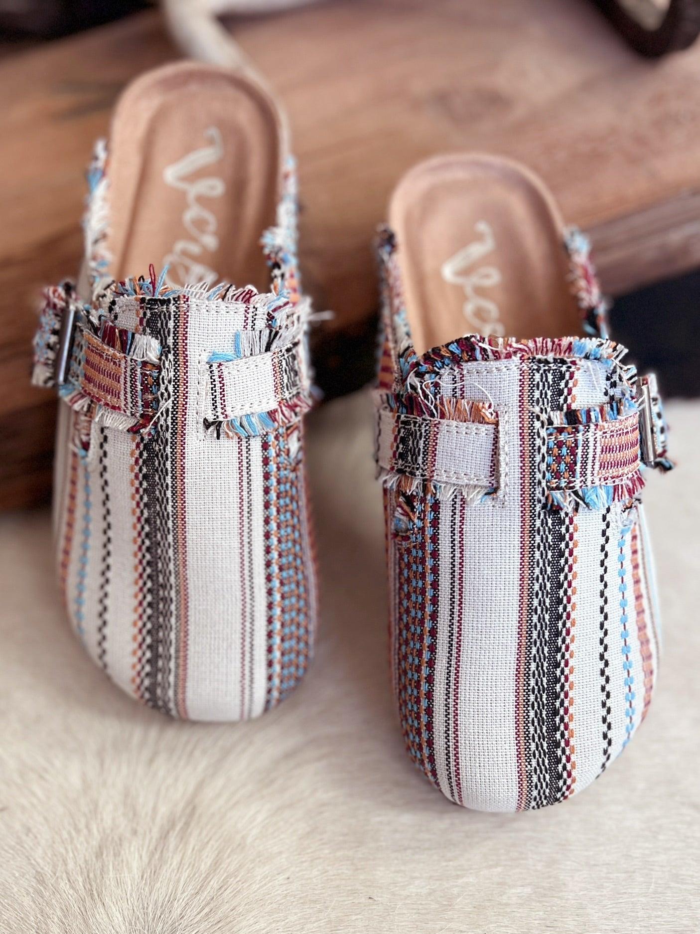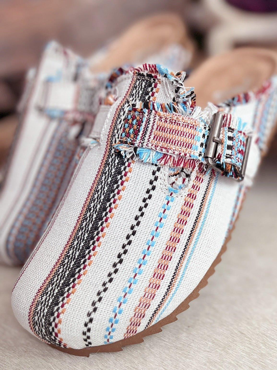 Serape Cream Basket Clog Shoes | Gussied Up Online Boutique Indulge in style and comfort with our Serape Cream Basket Clog Shoes! Slip into these comfy clogs featuring a cream serape print and frayed edges. The buckle on the sides adds a touch of elegance while the cushioned insoles provide all-day support. Perfect for any casual outfit!