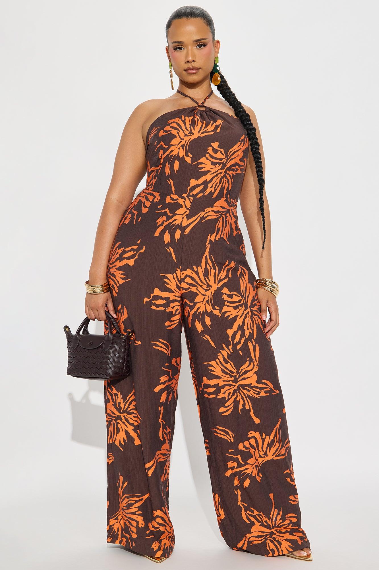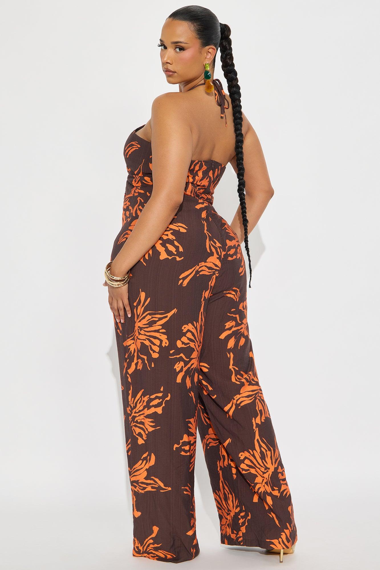 Available In Brown Combo. Jumpsuit Non Stretch Lined Halter Top Back Zipper Wide Leg 34" Inseam Shell: 83%Rayon 17%Nylon Lining: 100%Polyester Imported
