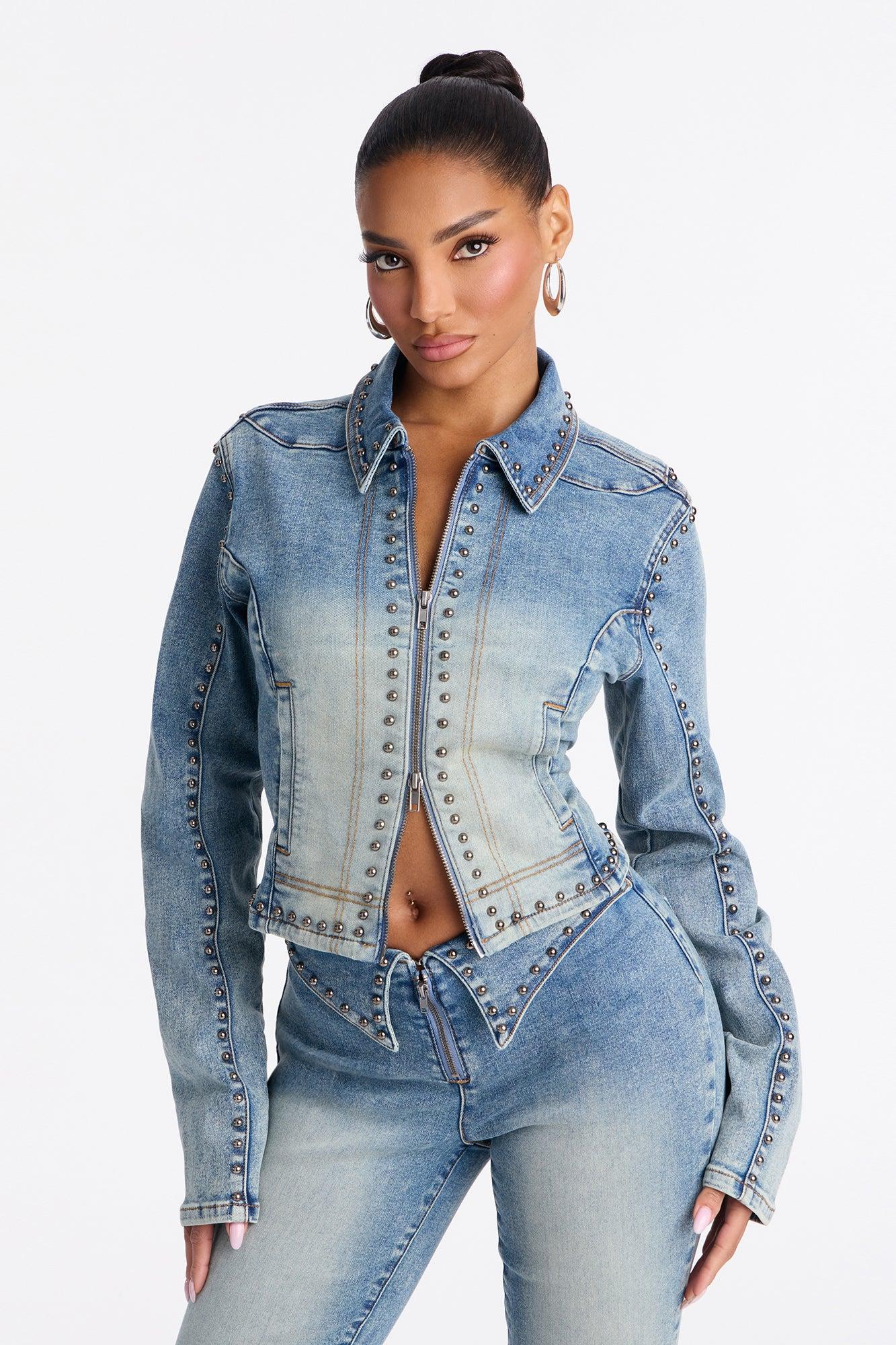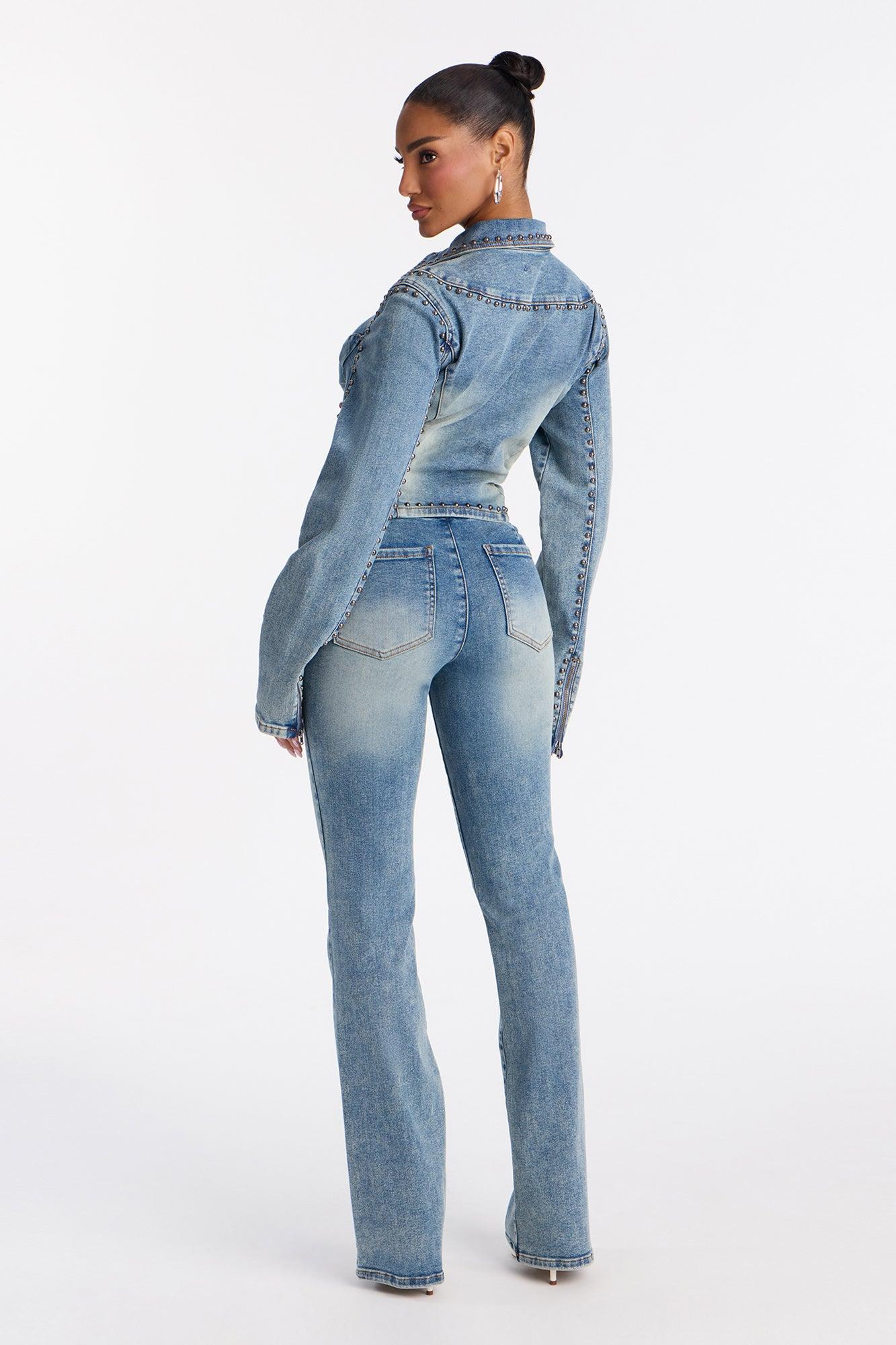 Available In Medium Wash. 2 Piece Ensemble Jacket And Pant Set Non Stretch Long Sleeve Zip Up Studded Washed Flare Leg 34" Inseam Disclaimer: Due To The Specialized Wash, Each Garment Is Unique. Self: 69% Cotton 29% Polyester 2% Spandex Imported
