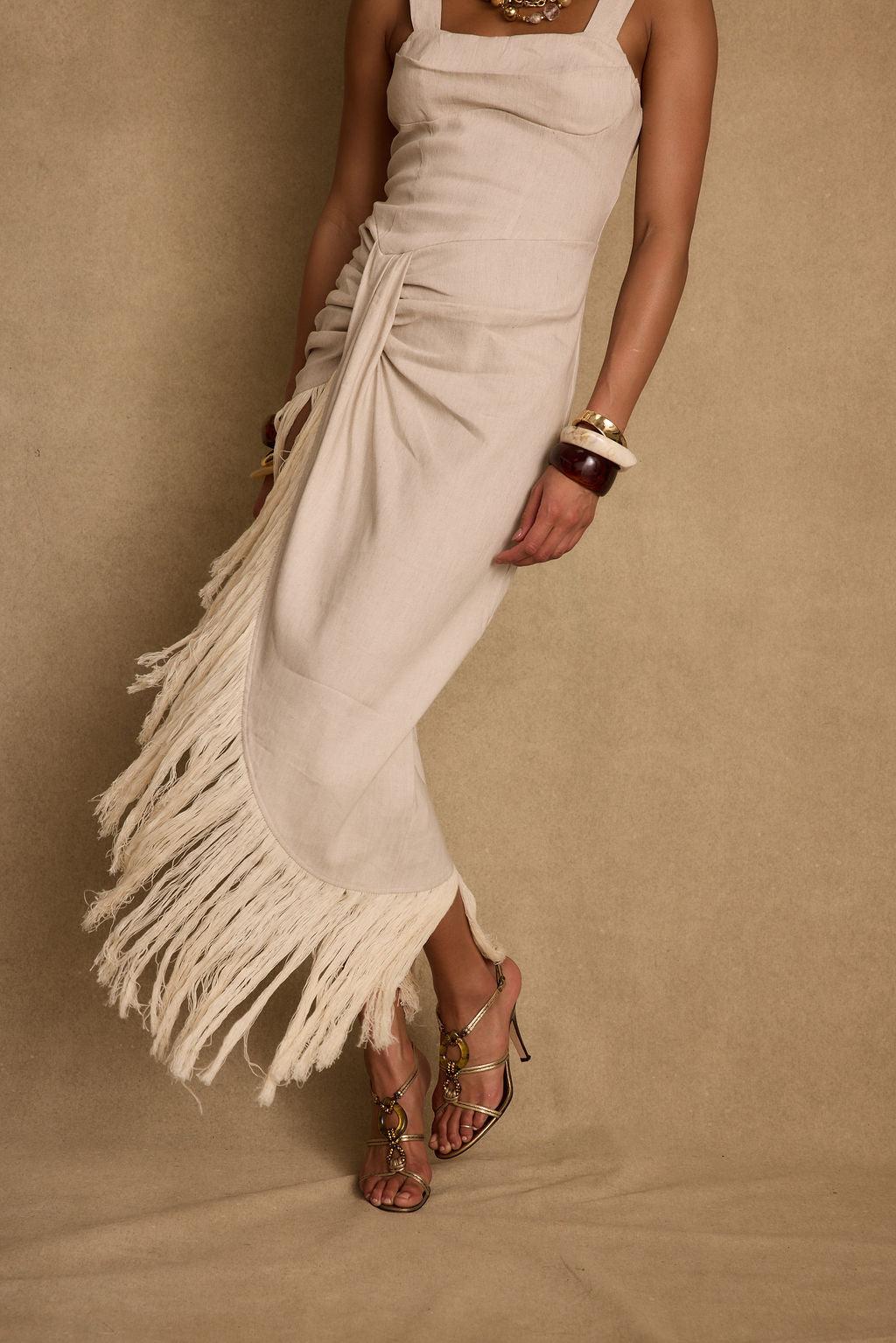 Earthy elegance, wrapped to perfection, the Serenade Beige Linen Wrap Midi Dress is giving major boho chic vibes on your vacation. Crafted from breathable linen with a flattering wrap silhouette, it features a fringe hemline that adds a touch of charm. Perfect for one-and-done dressing, layer with bangles and sandals for a look that can take you from sunup to sundown.