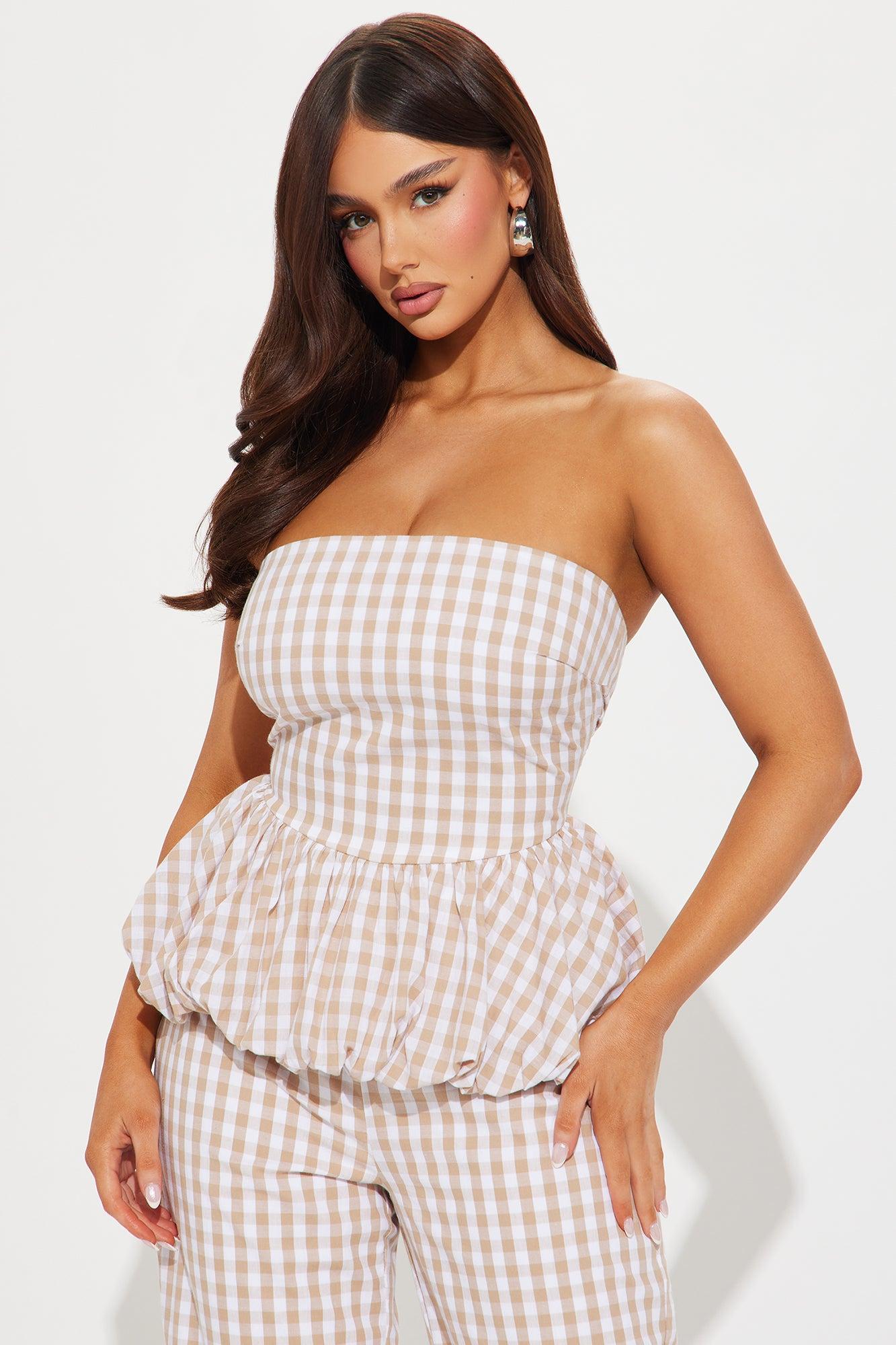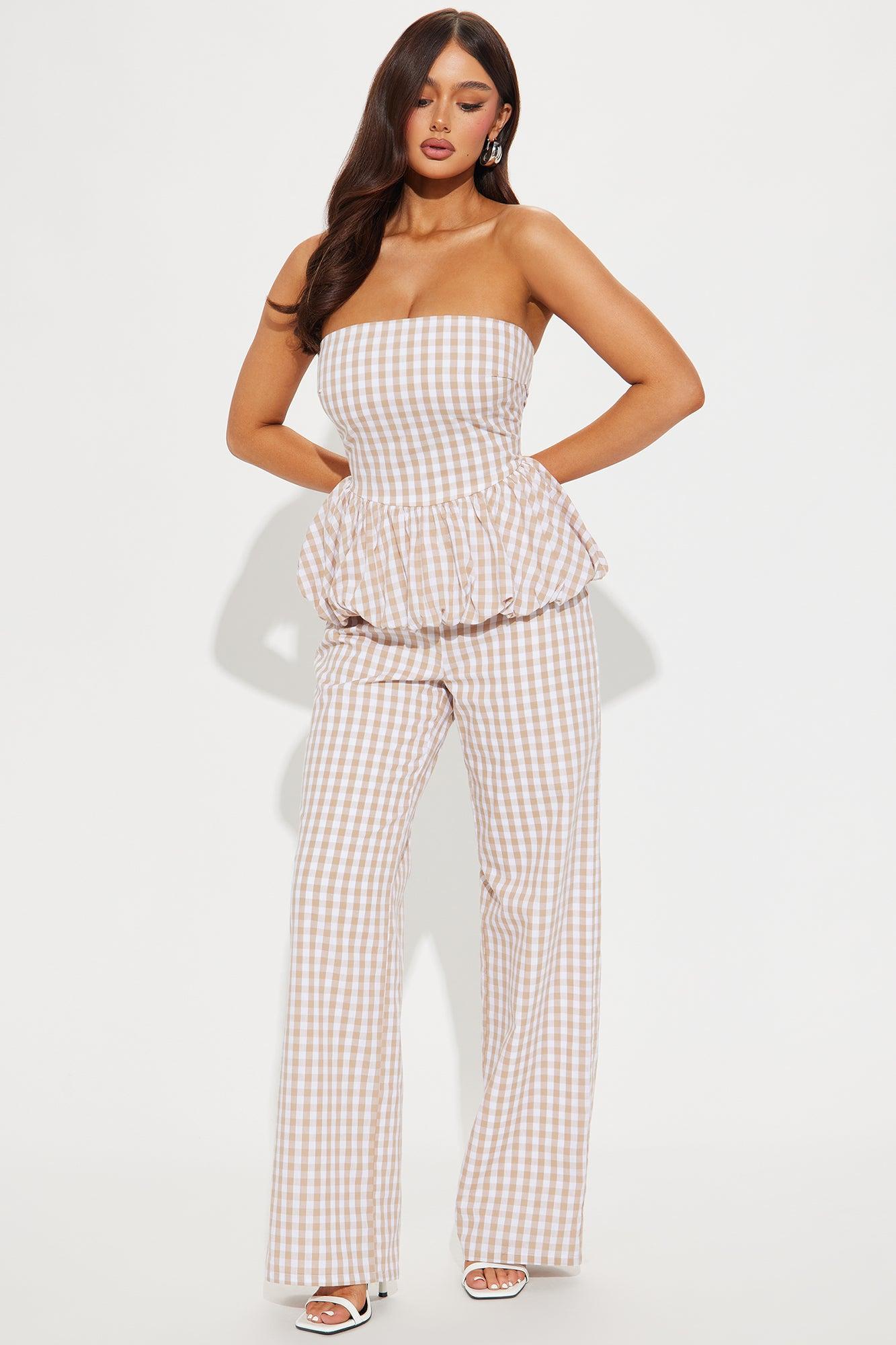 Available In Taupe/combo. Jumpsuit Strapless Peplum Wide Leg Smocked Back Hidden Back Zipper Lined Non Stretch Self: 100% Cotton Lining: 100% Polyester Imported California Proposition 65 WARNING: Cancer and Reproductive Harm - www.P65Warnings.ca.gov.