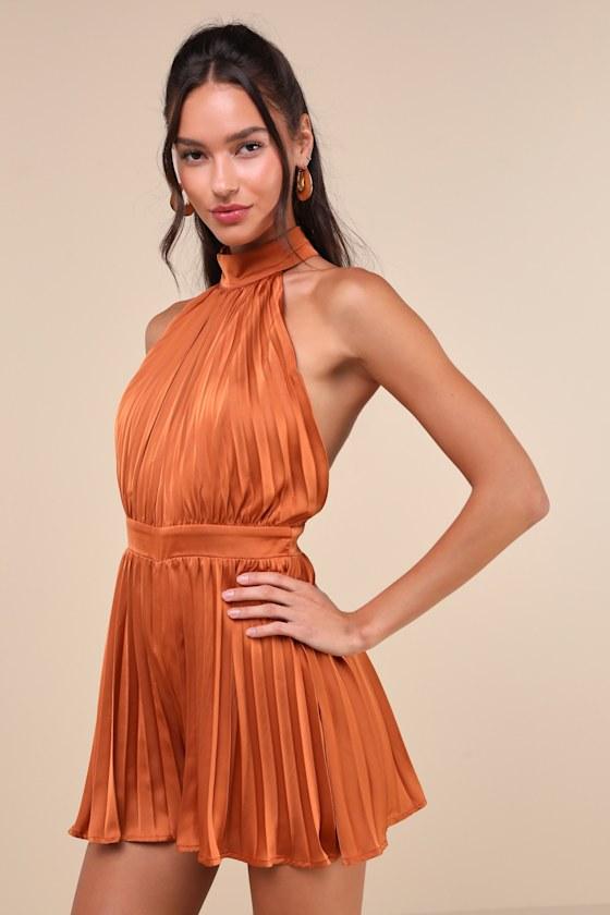 Make the most of any night by collecting as many numbers as possible in the Lulus Seriously Stunning Rust Orange Satin Pleated Backless Romper! Sleek, pleated woven satin shapes this luxe romper that features a sleeveless bodice with a high halter neckline (that secures with button-loop closures) and wide straps that lay across the otherwise open back. The fitted, banded waist tops flowy attached shorts that lend a flirty finish. Hidden back zipper/clasp.