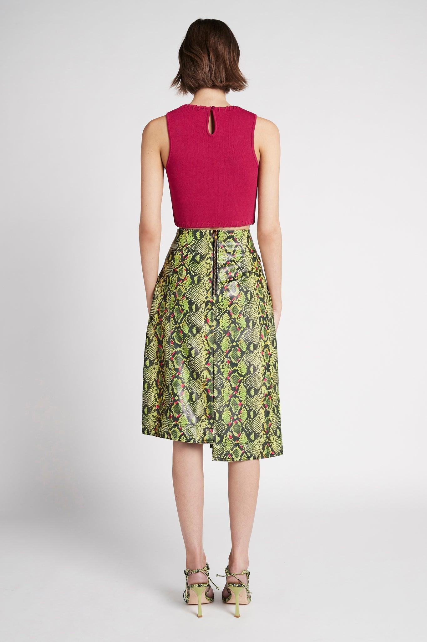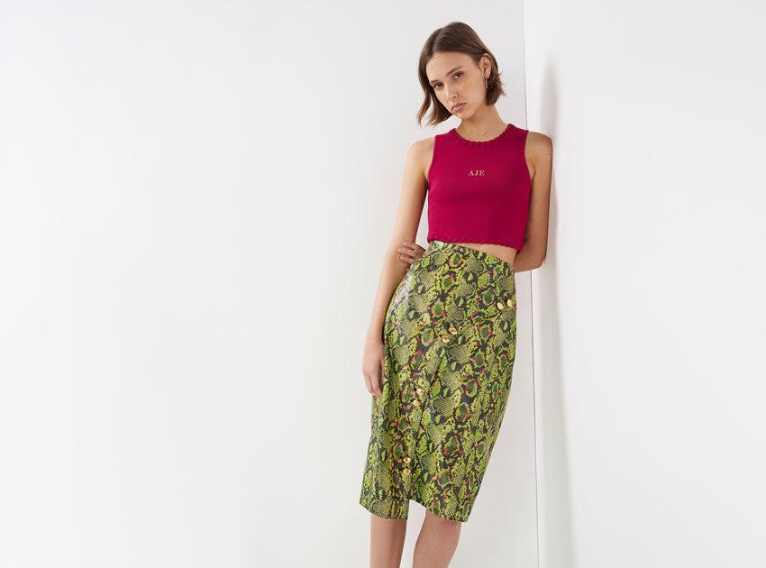 PRODUCT DETAILS High waisted midi skirt Waist darts Twin button placement Wrap front skirt Asymmetric hem finish Exposed zipper at back Shop All Skirts SIZE AND FIT Model wears a size AU 8/S Model: 179cm/5'10 Bust: 79 cm Waist: 61 cm Hips: 89 cm FABRICATION 100% PU Handle With Care Wash Garment Inside Out Cold Gentle Hand Wash
