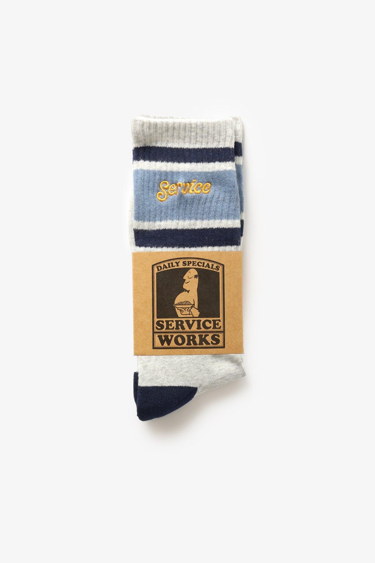 Service Works Logo Ringer Socks in Grey with Navy and Light Blue details and embroidered 'Service' script in Gold 67% Cotton, 30% Polyester, 2% Elastane, 1% Nylon