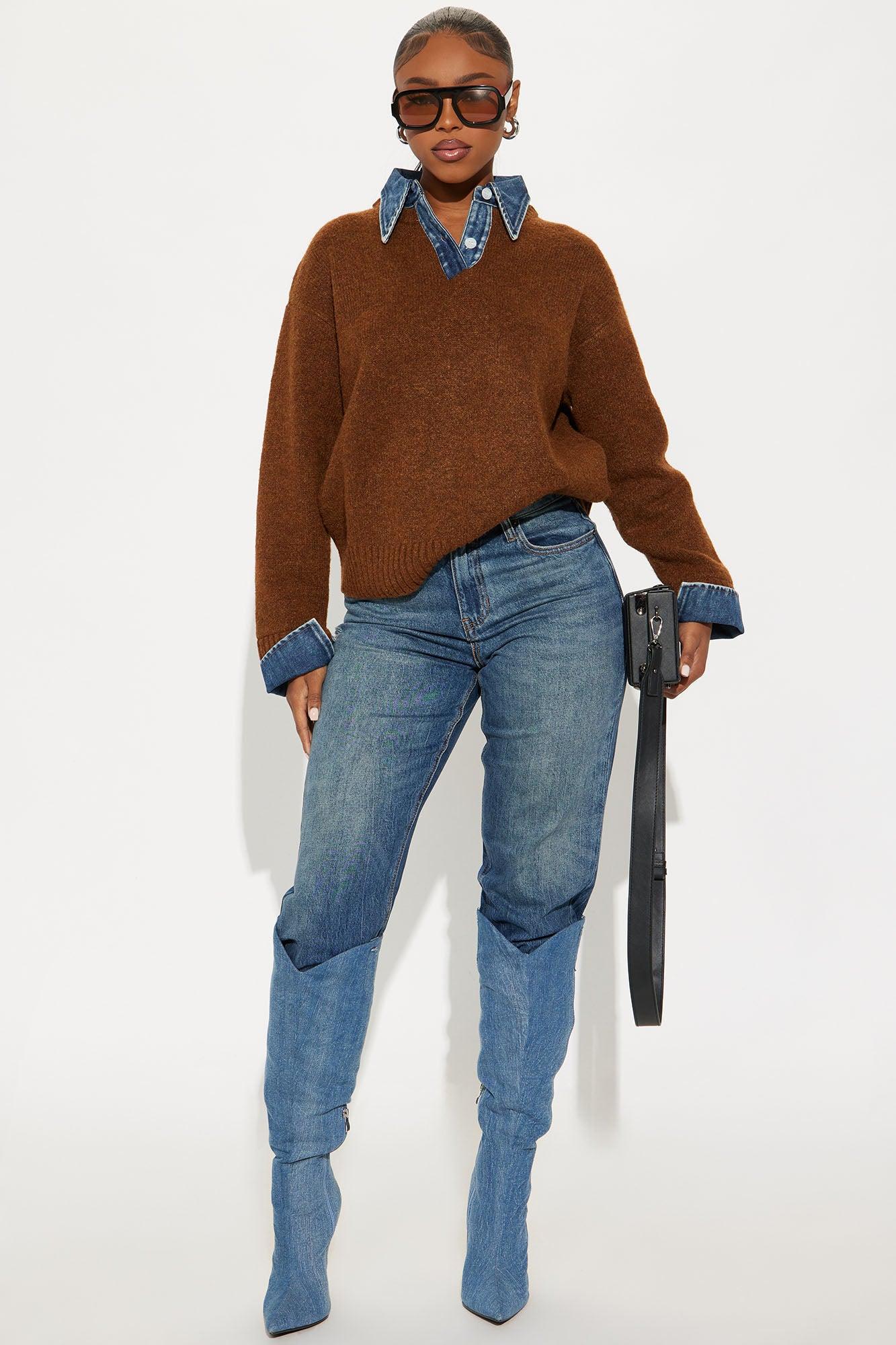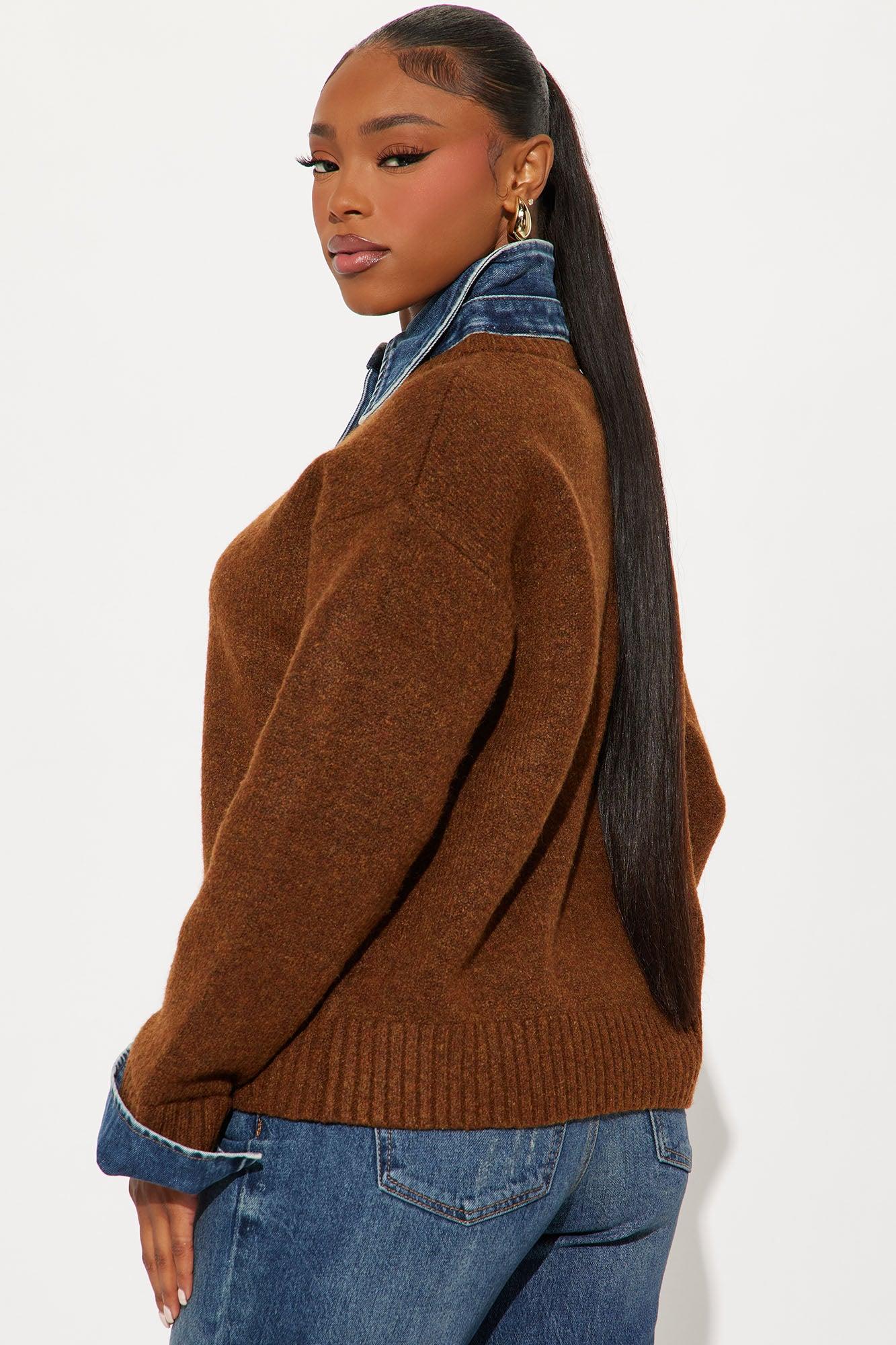 Available In Brown/combo. Pullover Sweater Quarter Buttons Denim Contrast Self: 74% Polyester 22% Acrylic 4% Elastane Contrast: 48% Cotton 27% Polyester 18% Viscose 4% Nylon 3% Acrylic Imported California Proposition 65WARNING: Cancer and Reproductive Harm - www.P65Warnings.ca.gov.