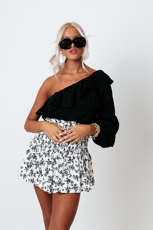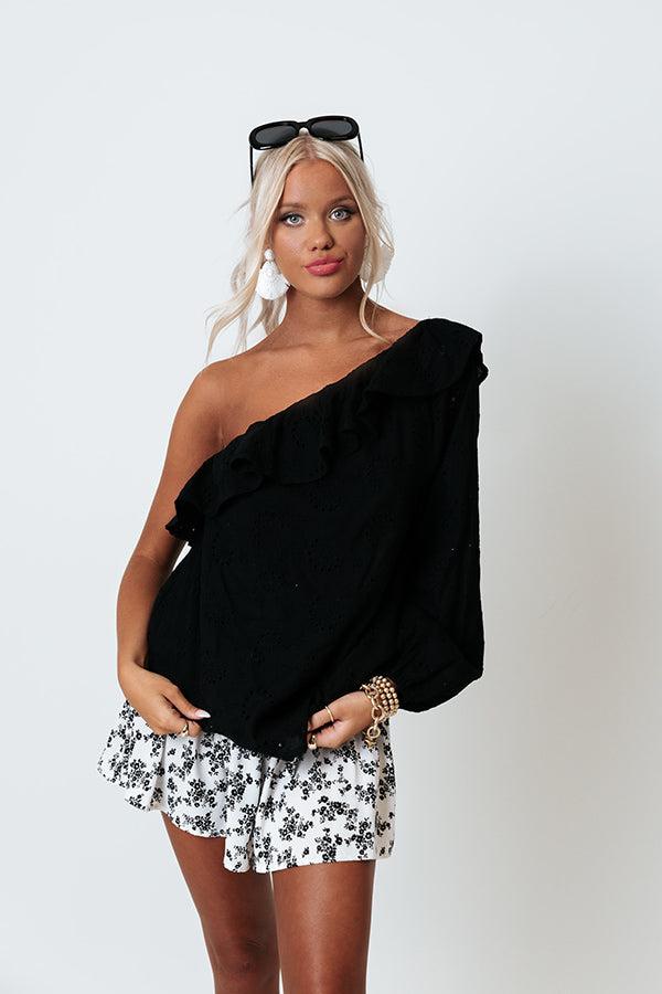You will be serving up major fashionista vibes when you wear this charming black top featuring lightweight material with intricate floral eyelet detailing, a diagonal neckline and upper back with ruffled overlay trim, a single long bubble sleeves, and a flattering silhouette that ends in a straight hemline! Measurements S : Bust 36", Hip 42", Length 24", Sleeve Length 25", Waist 40". M : Bust 38", Hip 44", Length 25", Sleeve Length 25.5", Waist 42". L : Bust 40", Hip 46", Length 26", Sleeve Length 26", Waist 44".