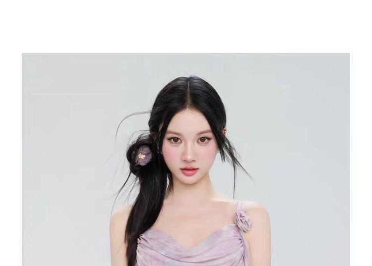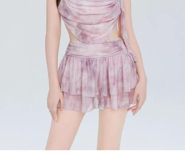 Set: Cowl Neck Tie Dye Floral Accent Ruched Tankini Top + Swim Skirt