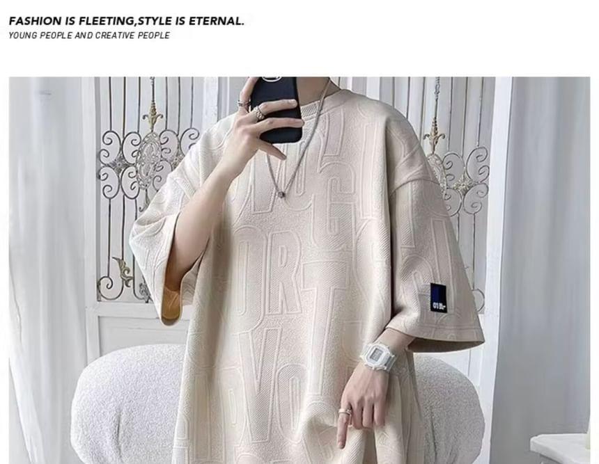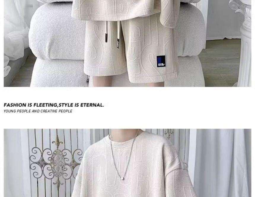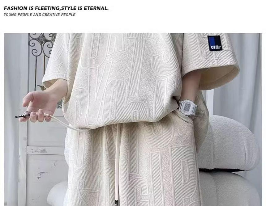 Set: Elbow-Sleeve Crew Neck Lettering Embossed Applique T-Shirt + Drawstring Waist Sweat Shorts