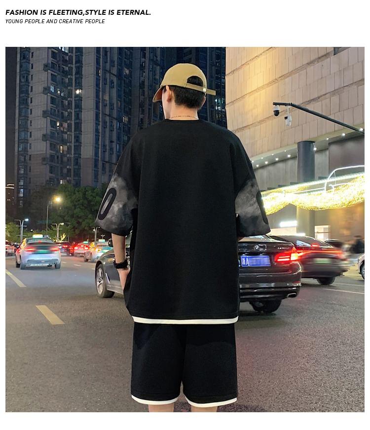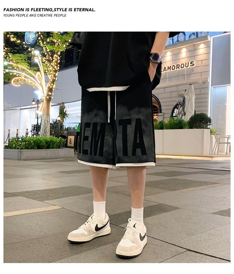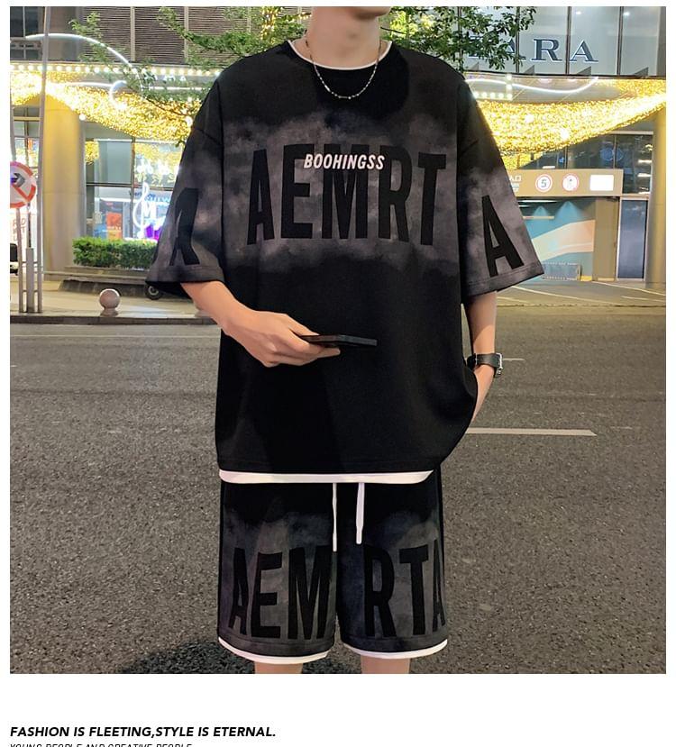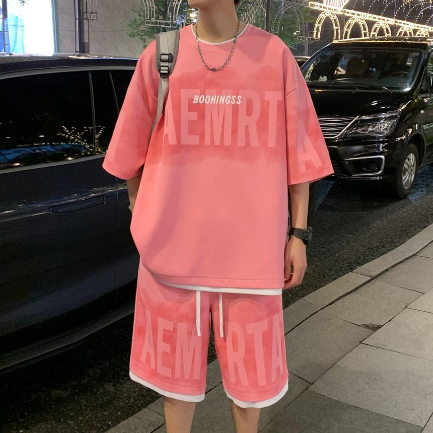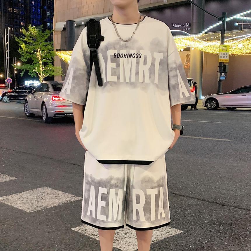 Set: Elbow-Sleeve Two Tone Lettering T-Shirt + Shorts