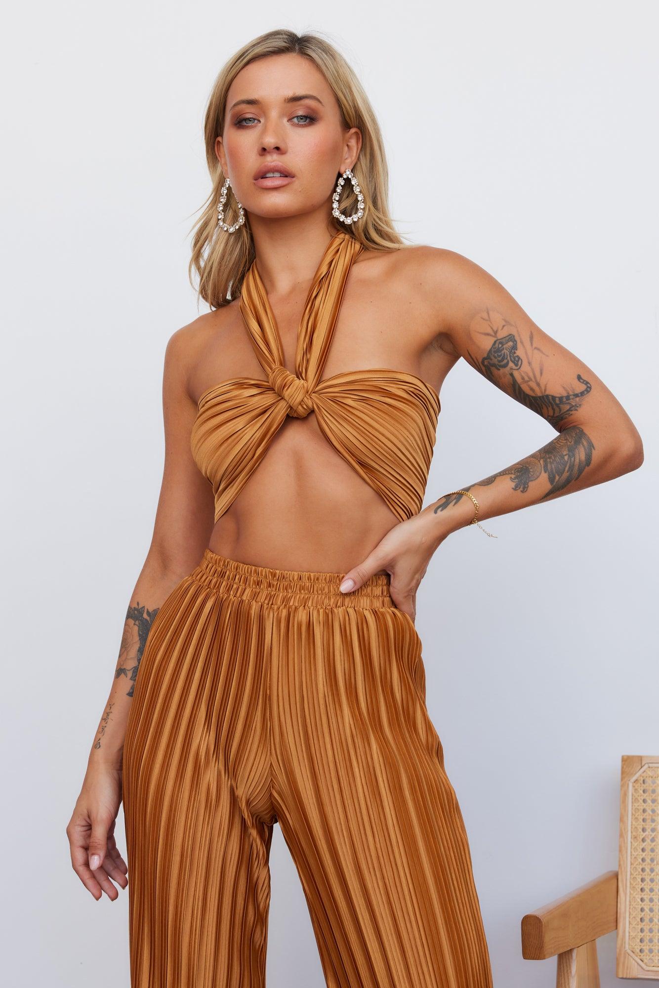 Length from waist to hem of size S: 95cm. Pants. Not-lined. Cold hand wash only. Model is a standard XS and is wearing size XS. True to size. Lightweight, stretchy satin fabric. Slip-on style. Polyester. Sure, you have rules you stand by - but we don't see the problem with that? Embrace your Set Heart with this comfy + stylish pair of pants. Featuring a loose fit and pleats all over. Style yours with the matching crop and heels.