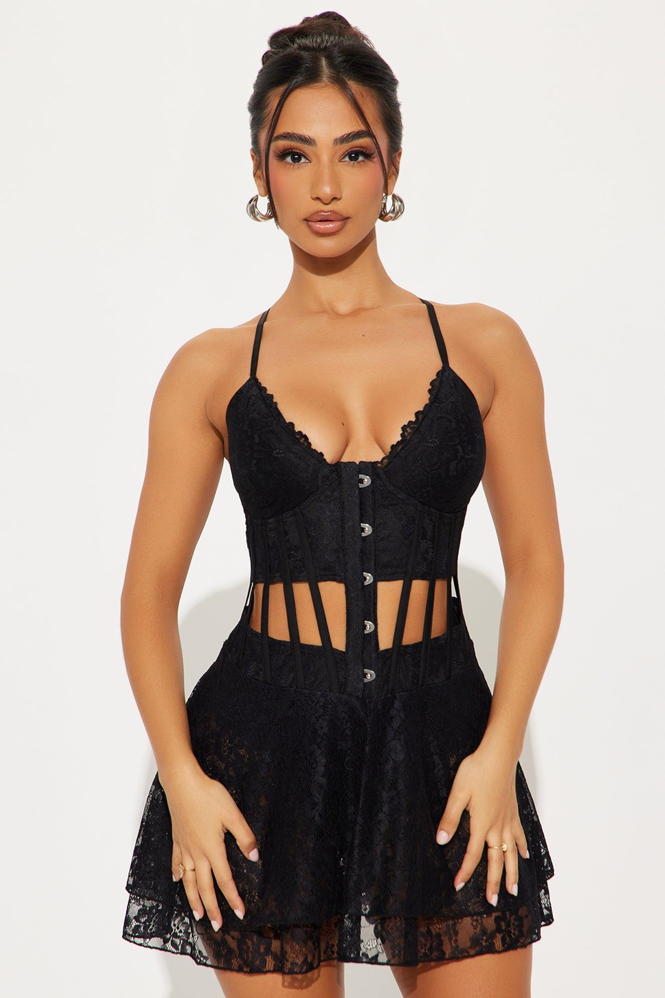 Available In Black And White. Corset Lace Micro Mini Dress Deep v-neck Adjustable spaghetti straps Padded bra cups Hook and eye Corset waist w/ cut outs Sheer Lace up back Length = 31" Underwear Lining Final Sale Main Fabric: 90% Nylon 10% Spandex Lining: 95% Polyester 5% Spandex Imported
