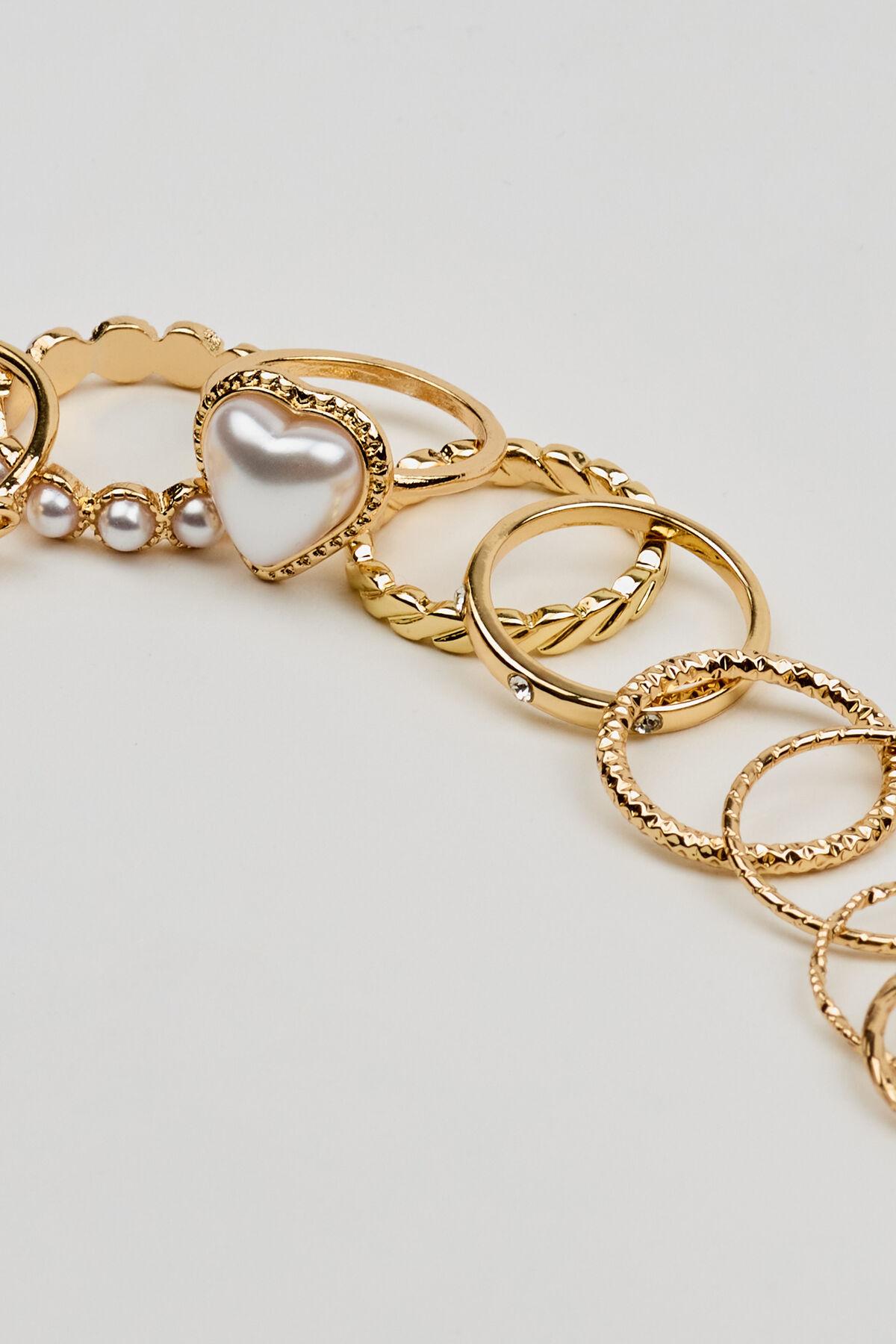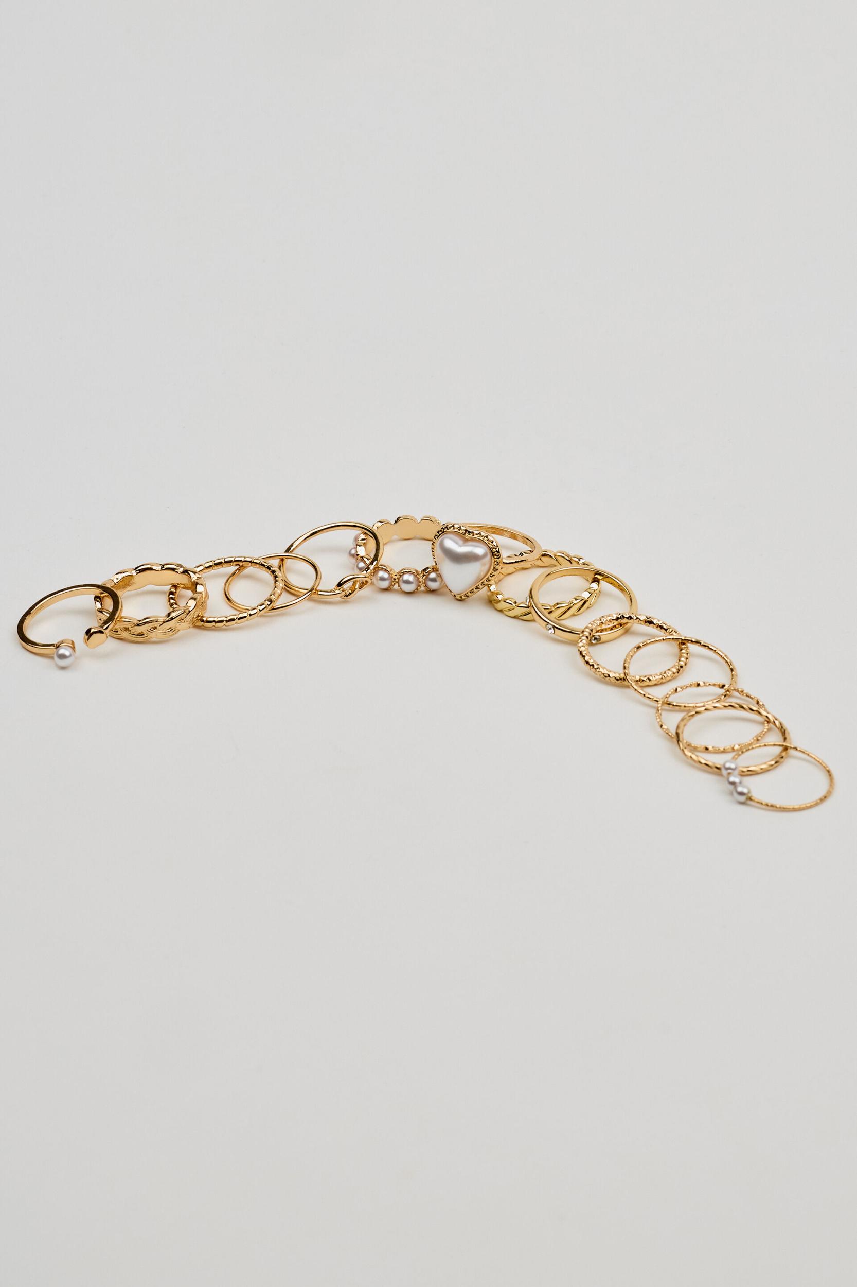This calls for a matching necklace . Features Set of 14 sculptural rings with pearl and crystal-cut detailing Stackable All jewelry is lead, nickel, and cadmium free Imported