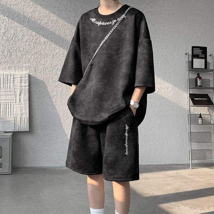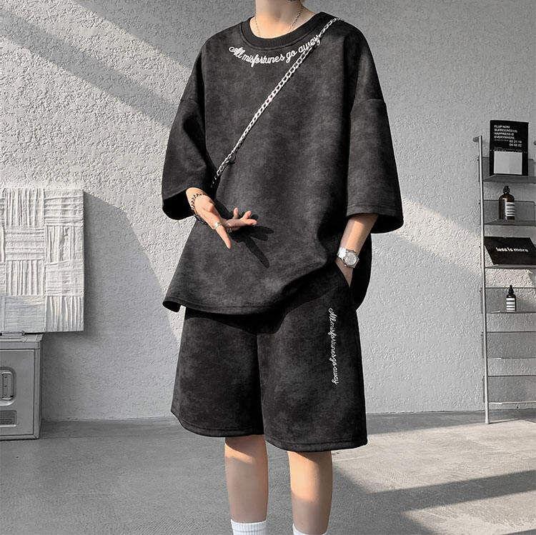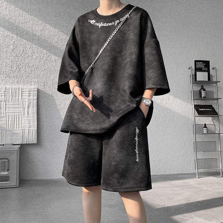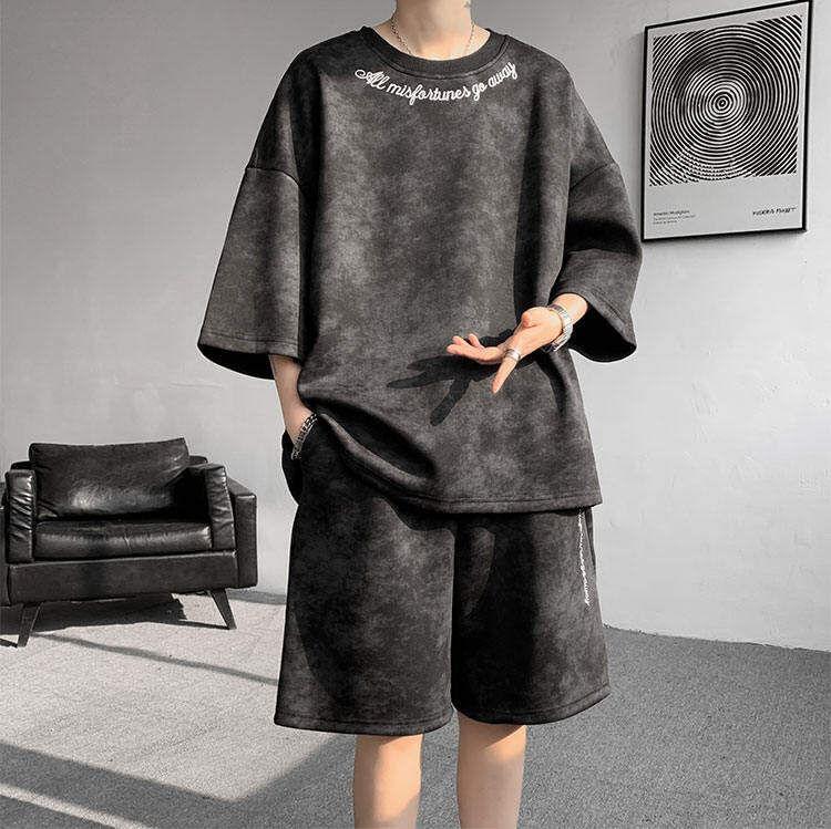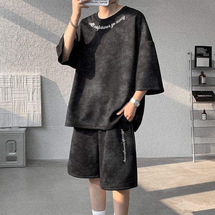 Set: Short Sleeve Round Neck Lettering Embroidered Tie Dye T-Shirt + Elastic Waist Sweat Shorts